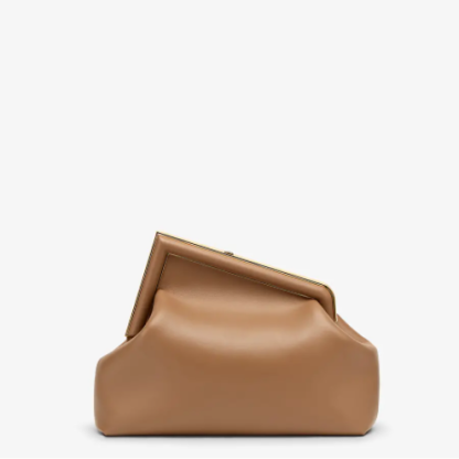 Medium Fendi First bag made of soft, beige nappa leather with oversized metal F clasp bound in tone on tone nappa leather.