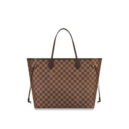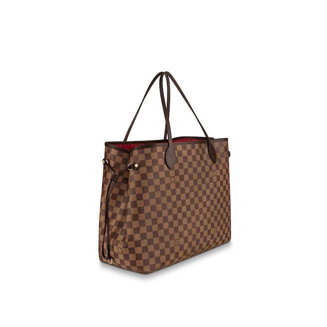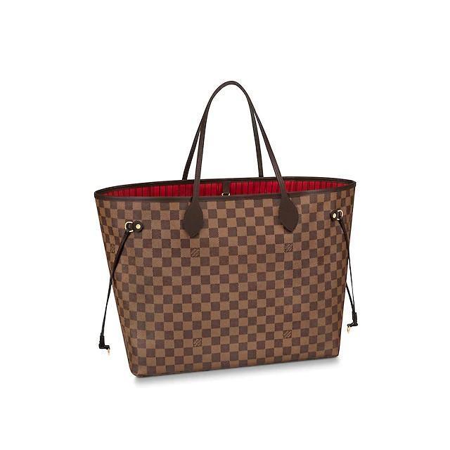 The Neverfull MM tote unites timeless design with heritage details. Elegant in Damier Ebene canvas with natural cowhide trim, it is roomy but not bulky, with side laces that cinch for a sleek allure or loosen for a casual look. Slim, comfortable handles slip easily over the shoulder or arm. Lined in colorful textile, it features a removable pouch which can be used as a clutch or an extra pocket.