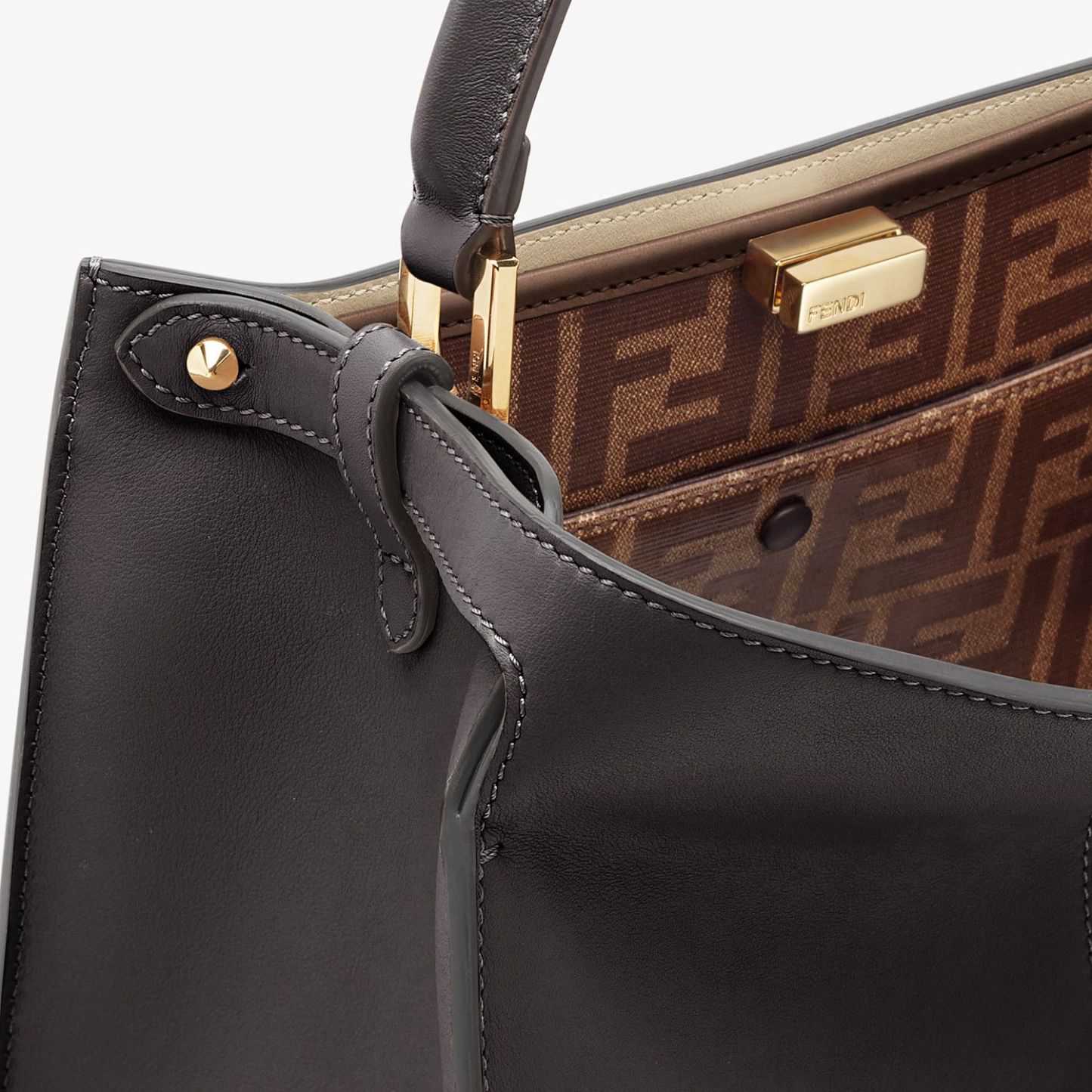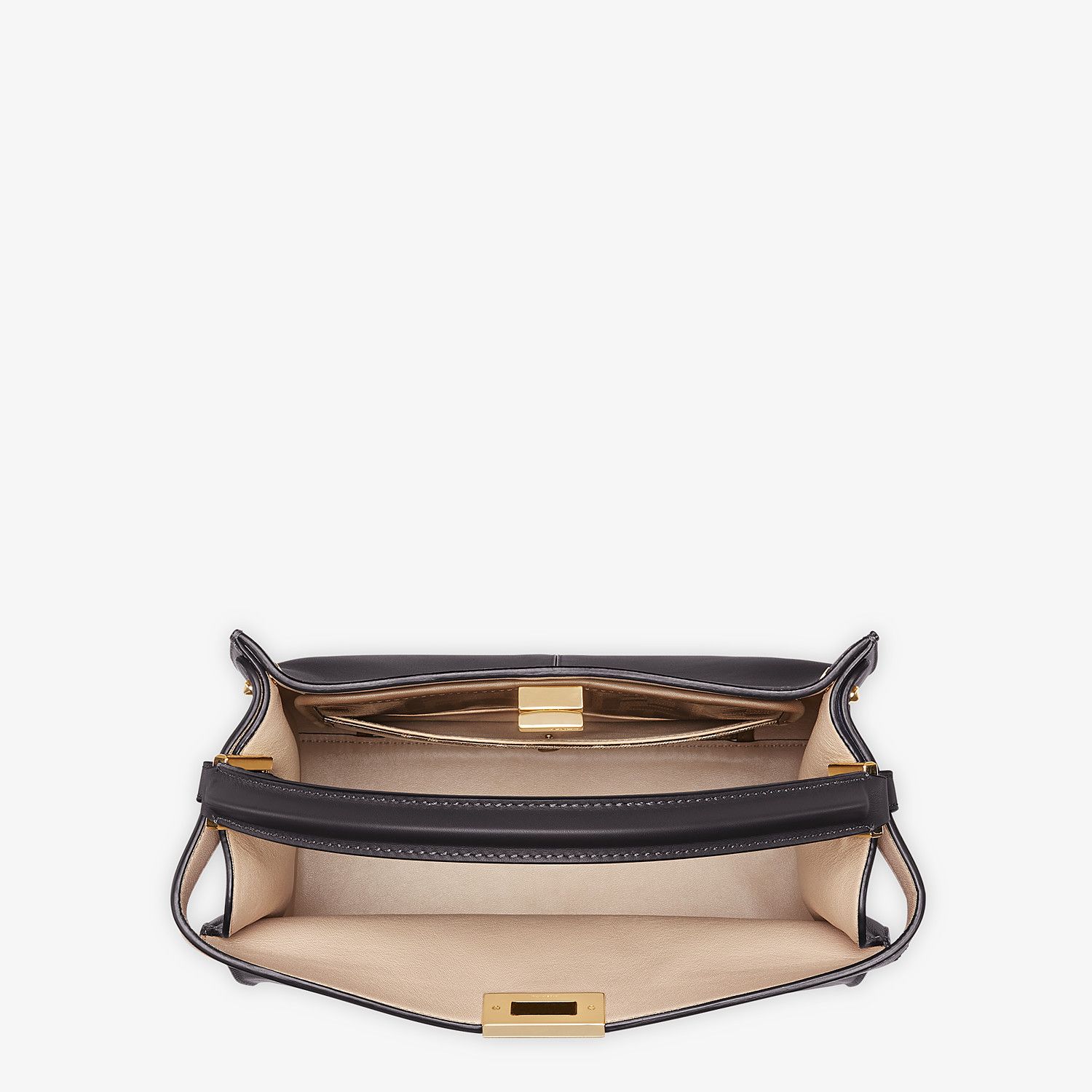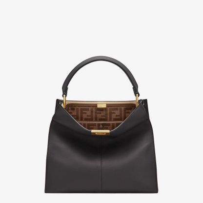 Medium Peekaboo X-lite bag, made of black leather and embellished with the classic twist lock. Featuring a contrasting leather lining, an internal compartment, a large inner pocket in glazed fabric with a jacquard FF motif and gold-finish metalware. Can be carried by hand with the handle or on the shoulder thanks to the comfortable, detachable fabric shoulder strap. Made in Italy