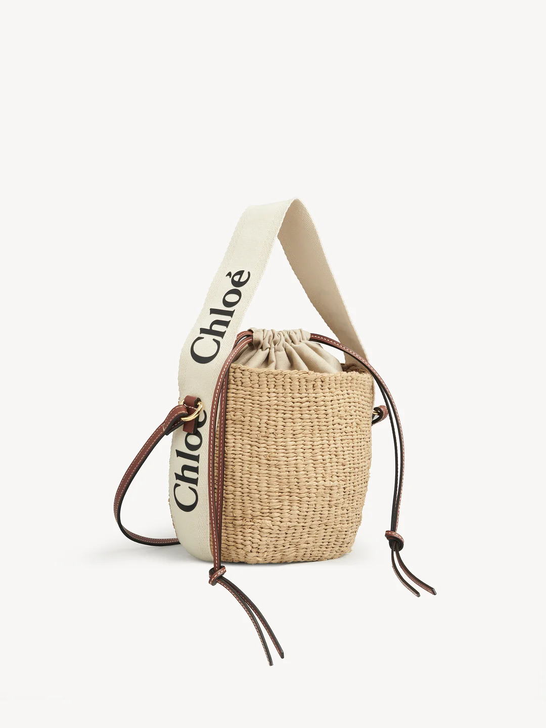Crafted in a compact, round basket shape for an easy summer attitude, this small Woody basket is hand-woven from partly upcycled materials by independent craftswomen in Kenya. The basket has a drawstring fastening and a long leather strap for shoulder and cross-body wear. Echoing the Maison's Woody mule, the line's signature Chloé logo ribbon details the natural fiber and creates a wide handle.