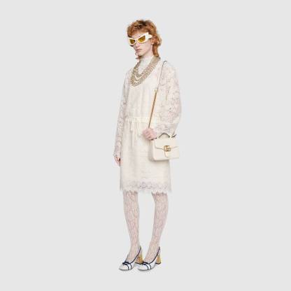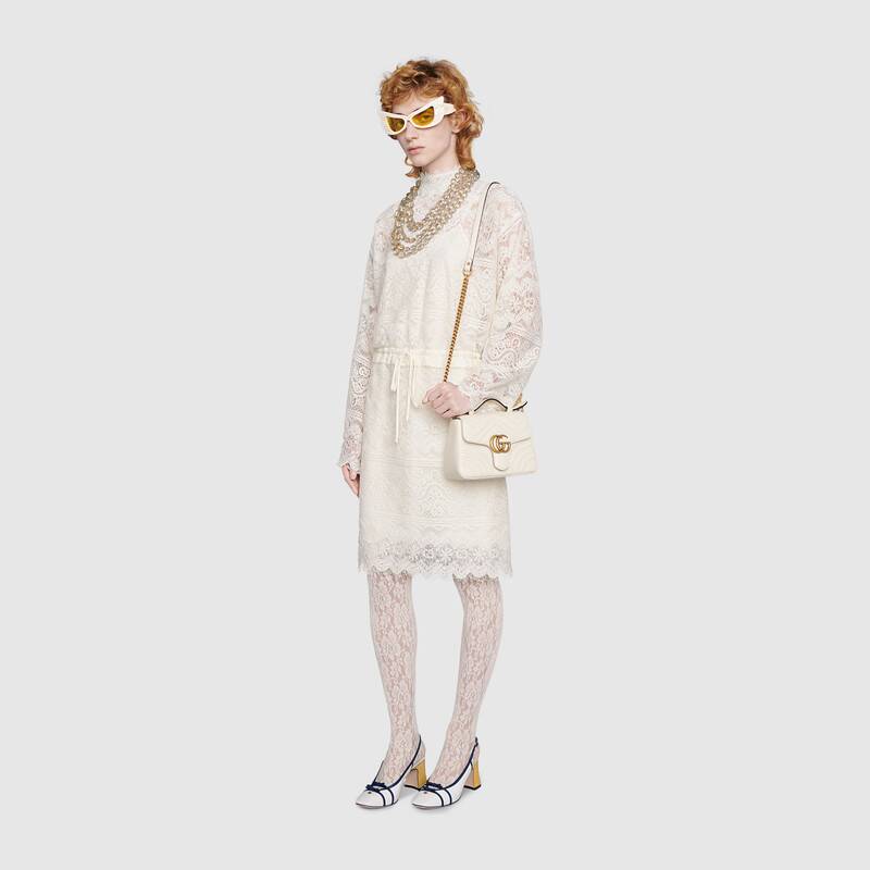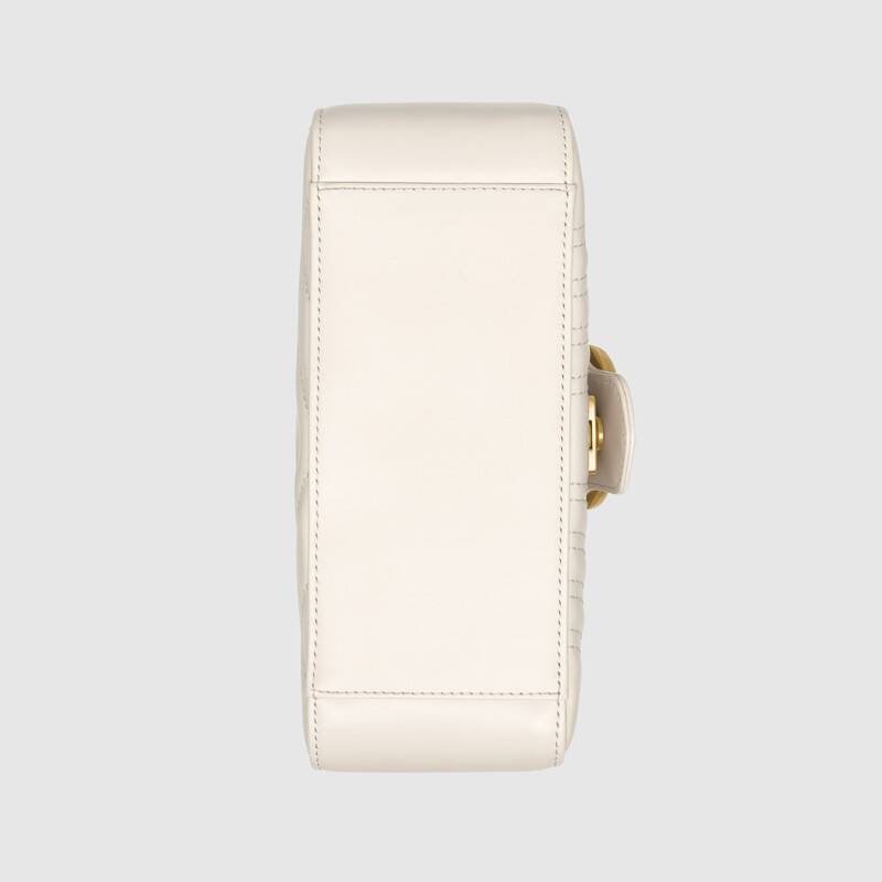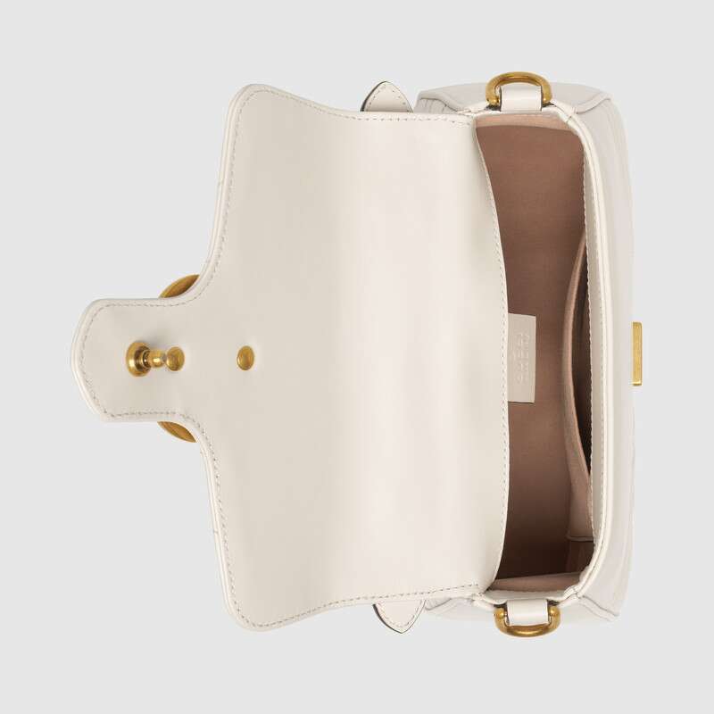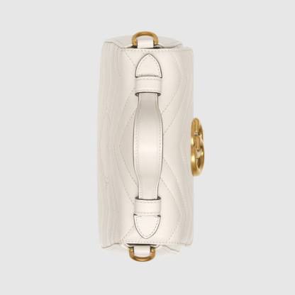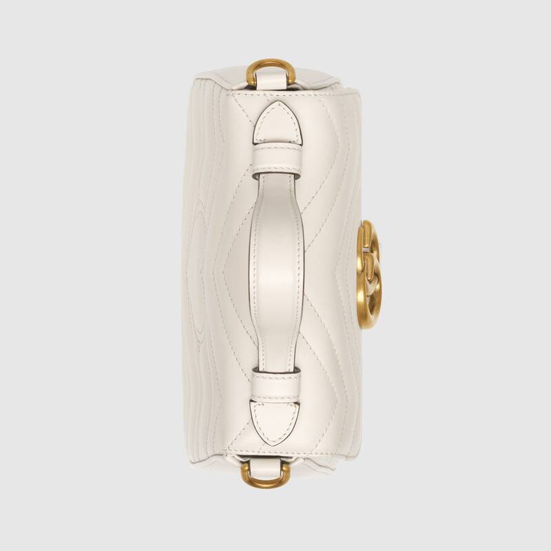 The mini GG Marmont top handle bag has a softly structured shape and an oversized flap closure with Double G hardware. Equipped with a leather top handle and chain shoulder strap, made in matelassé chevron leather with a heart on the back.