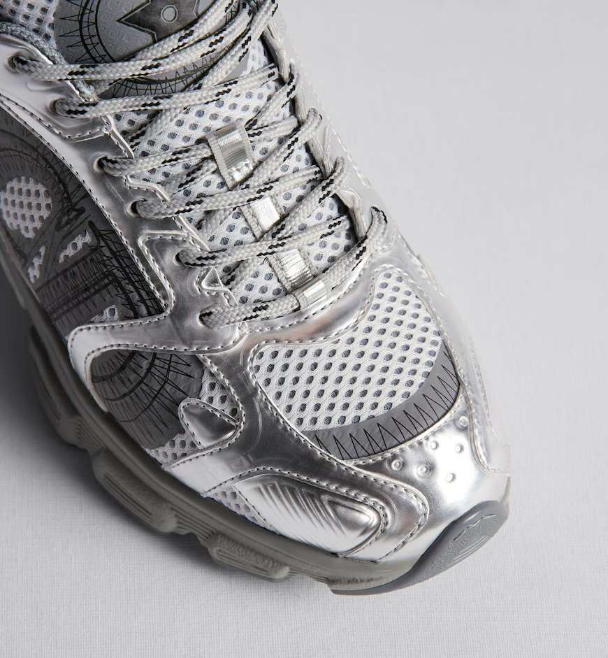 New for Fall 2024, the Dior Chrono sneaker revisits the running shoe with the House's couture codes. Pairing gray mesh with silver-tone laminated leather-effect panels, it is accented by hallmark details like the CD signature on the sides, a star patch on the tongue and a rear Dior signature. Featuring three-tone laces and an ultra-lightweight sole adorned with a star, the sneaker will complete laid-back outfits year-round.