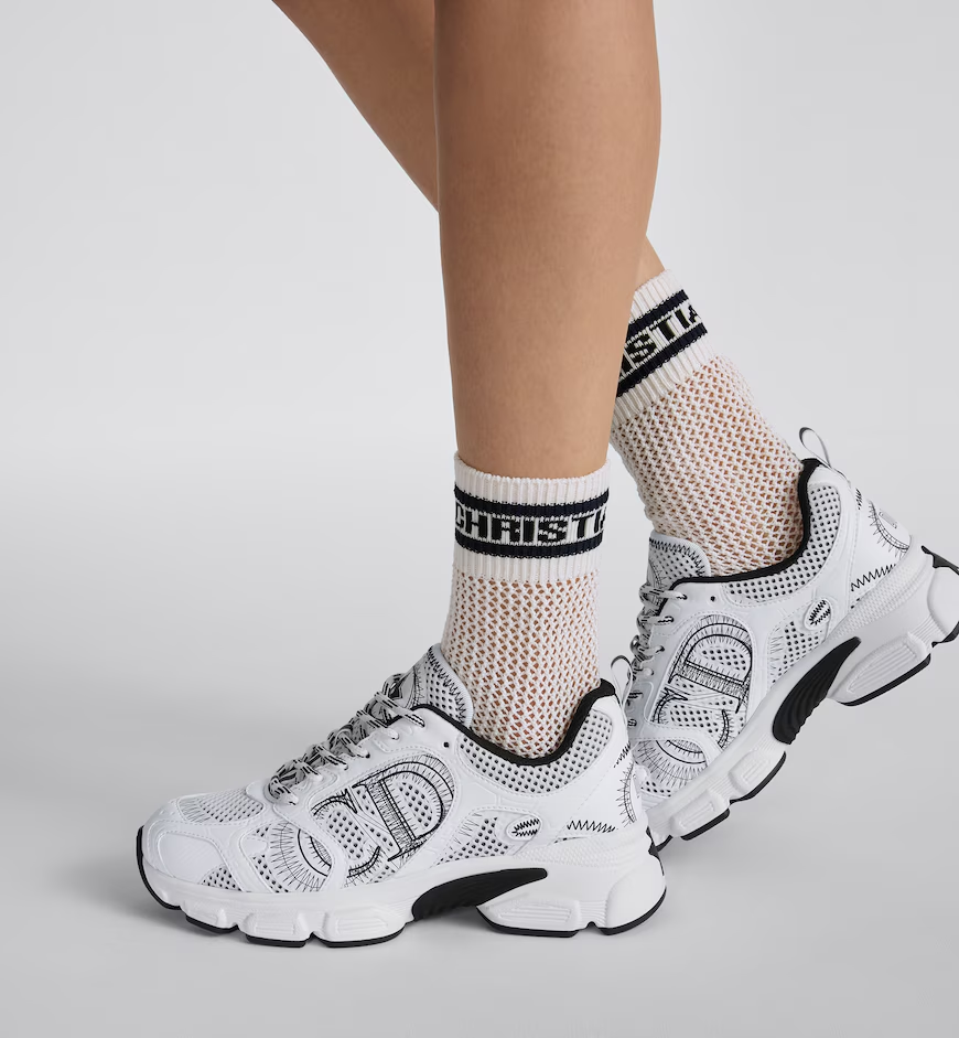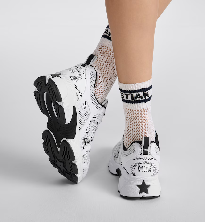 New for Fall 2024, the Dior Chrono sneaker revisits the running shoe with the House's couture codes. Pairing mesh with leather-effect panels in white and black, it is accented by hallmark details like the CD signature on the sides, a star patch on the tongue and a rear Dior signature. Featuring two-tone laces and an ultra-lightweight sole adorned with a star, the sneaker will complete laid-back outfits year-round.
