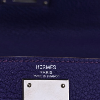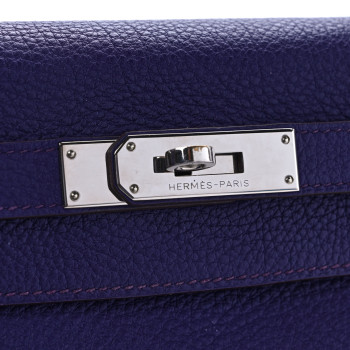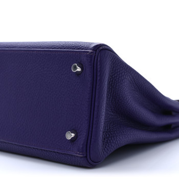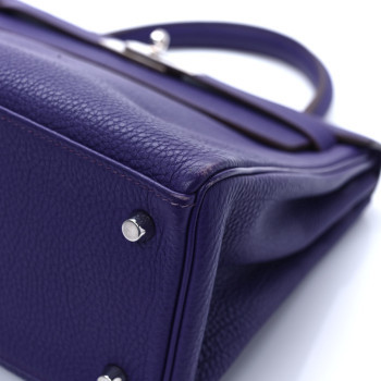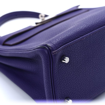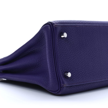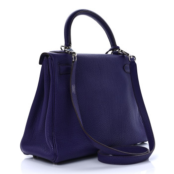 This is an authentic HERMES Togo Kelly Retourne 28 in Iris. This stylish Kelly handbag classic is crafted of beautifully textured calfskin leather in purple. The bag features a leather clasp top handle and a crossover flap with strap closure and a signature Kelly palladium silver plated turn lock with a padlock and a hanging clochette with keys. These open to a chevre goatskin leather interior.