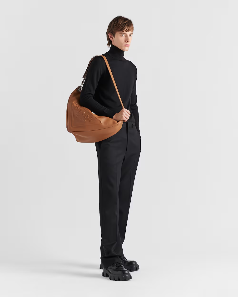 Defined by an adjustable shoulder strap to be worn in different ways, this versatile triangular-shaped leather bag reimagines Prada's iconic geometric logo in a new way and adds delicate tonal details for a monochrome, single-material effect.