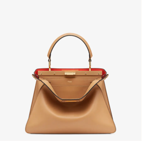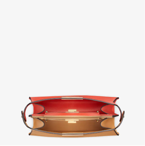 Iconic medium Peekaboo ISeeU bag made of beige leather on one side and red leather on the other. Decorated with the iconic twist lock on both sides and tone on tone plexiglass details. Featuring soft nappa leather lining visible from the outside, two compartments separated by a stiff partition, a removable nappa leather inner pocket that can be personalised, and gold-finish metalware. Can be carried by hand or on the shoulder thanks to the handle and the two-tone adjustable, detachable shoulder strap.