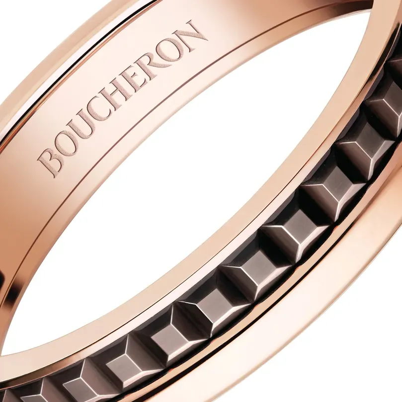 Combining two iconic Boucheron codes – the gadroon and the clou de Paris –, the Quatre Classique wedding band combines brown PVD with pink gold, engraved and polished at our Place Vendôme workshops. When you wear this piece with the pink gold Quatre ring, you show you have nothing further to prove in terms of freedom and femininity.
