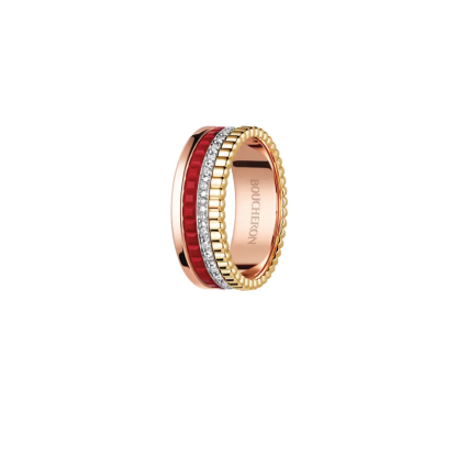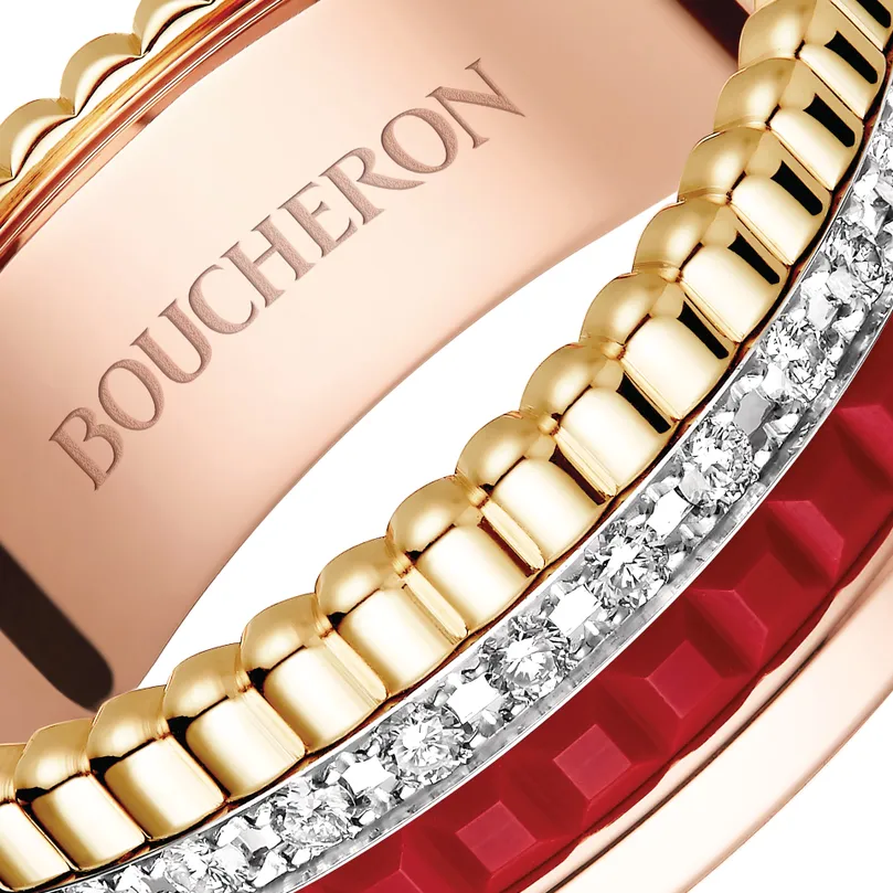 This ring is an alluring way to assert your passion. Here, red ceramic captures the eye, mingling with yellow, white and pink golds, as well as diamonds. It brings even the most classic of looks a touch of rebellion and a wind of freedom.