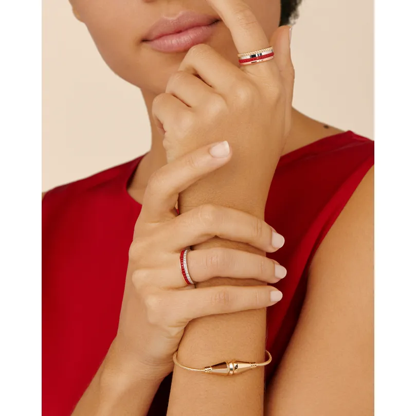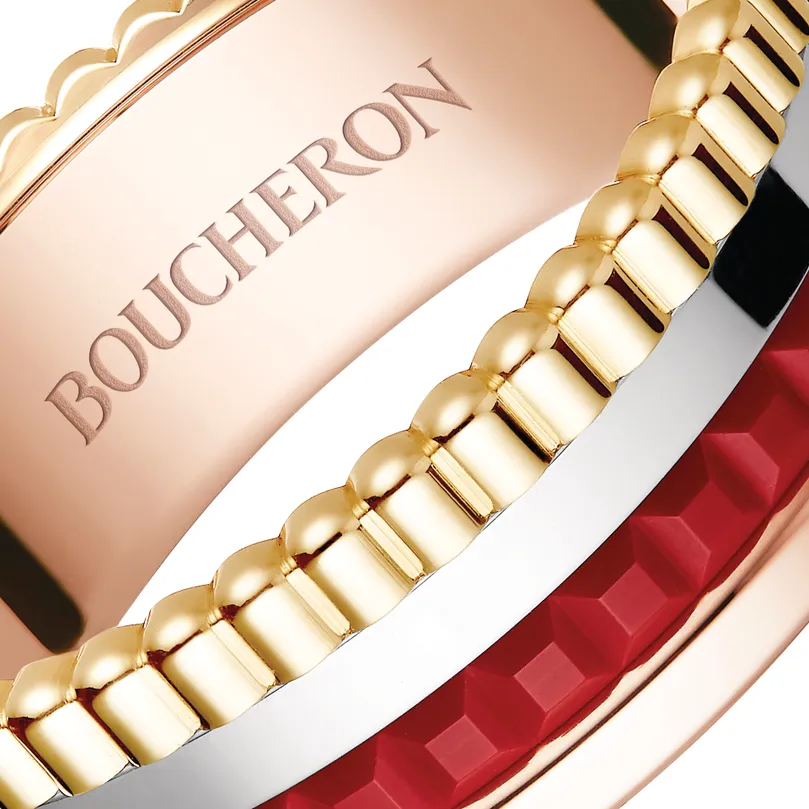 An icon of the Boucheron style, the Quatre Red Edition ring surprises through its bold contrast. Adorning the clou de Paris with a seductive red, it combines white, yellow and pink gold. This assertive couture piece paints the town red.
