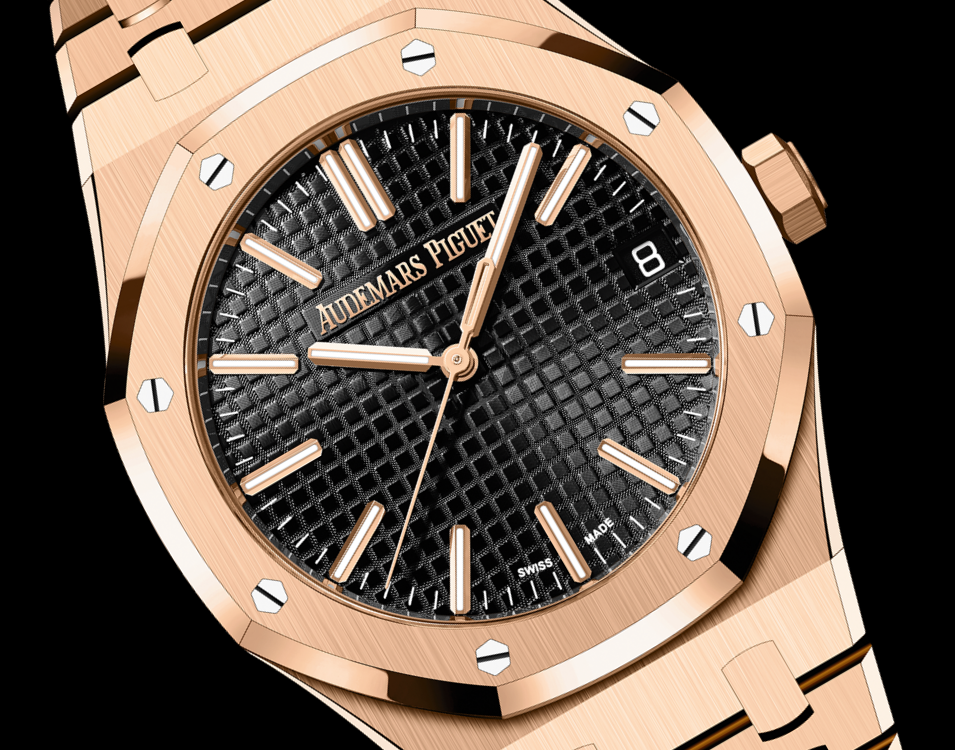 The 18-carat pink gold Royal Oak Selfwinding in 41 mm is enriched with the collection’s latest ergonomic design evolution and contrasted with a black "Grande Tapisserie" dial.