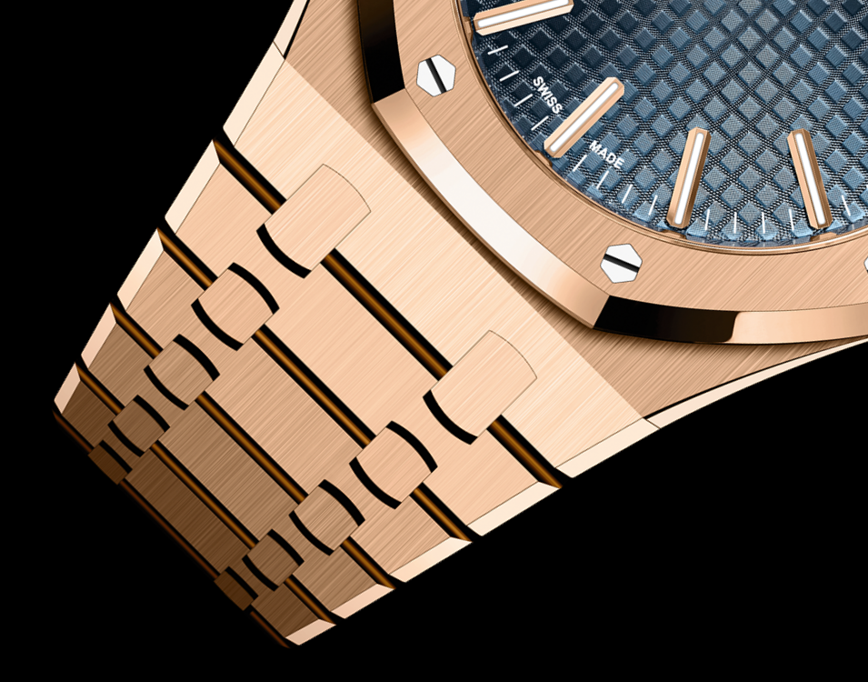 “Bleu nuit nuage 50” dial with “Grande Tapisserie” pattern, pink gold applied hour-markers and Royal Oak hands with luminescent coating.