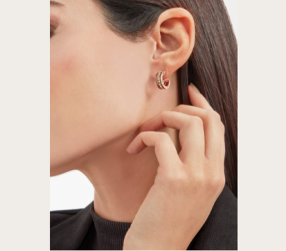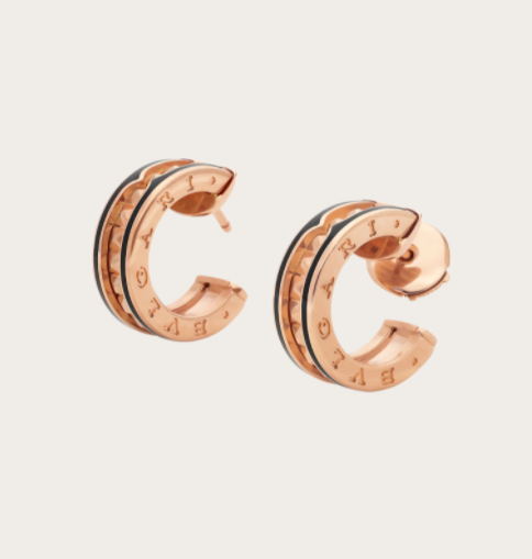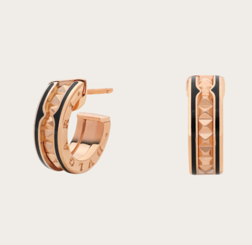 Drawing its inspiration from the world’s most renowned amphitheater, the Colosseum, B.zero1 Rock is a groundbreaking statement of Bvlgari’s creative vision infused with a touch of irreverence. Challenging the very essence of jewelry aesthetics, its distinctive spiral is reimagined with gold studs, highlighting the unapologetic and visionary spirit of Bvlgari’s icon of design. B.zero1 Rock 18 kt rose gold earrings with black ceramic.