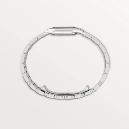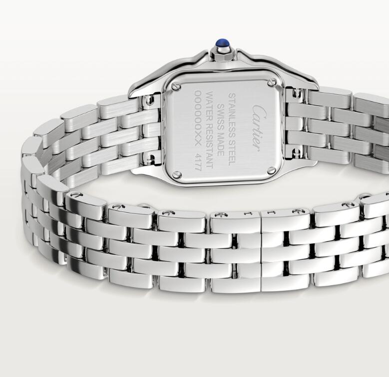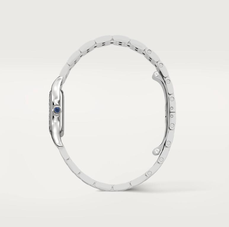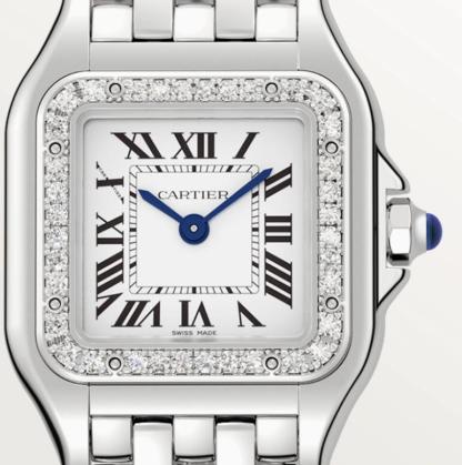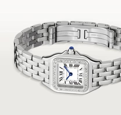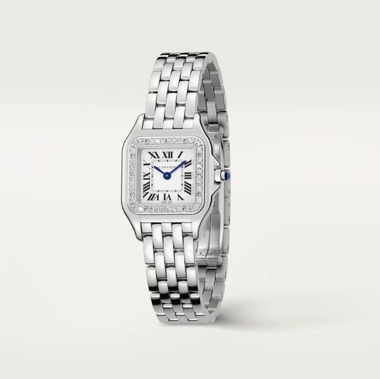 Panthère de Cartier watch, small model, quartz movement. Case in steel, bezel set with brilliant-cut diamonds, dimensions: 22 mm x 30 mm, thickness: 6 mm, crown set with a synthetic blue spinel, silvered dial, blued-steel sword-shaped hands, steel bracelet, water-resistant to 3 bar (approx. 30 meters)