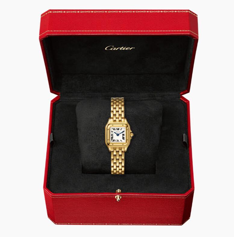 Panthère de Cartier watch, mini model, quartz movement. 18K yellow gold case and bracelet. 18K yellow gold octagonal crown set with a sapphire cabochon. Silver dial, blued-steel sword-shaped hands, sapphire crystal. Case dimensions: 25 mm x 21 mm, thickness: 6 mm. Water-resistant up to 3 bar (approx. 30 meters/100 feet)