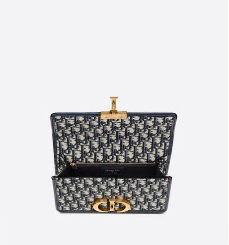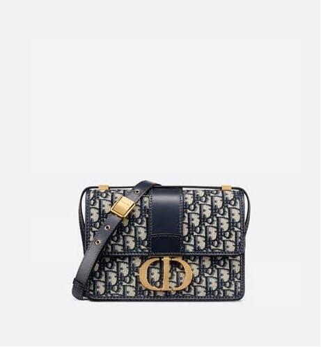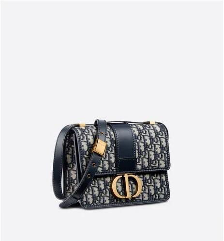 The 30 Montaigne line is inspired by the emblematic address and offers essential pieces that embody the House's iconic codes. The handbag is crafted in blue Dior Oblique jacquard for an elegant and modern look. The flap is embellished with an antique gold-finish metal 'CD' clasp, inspired by the seal of a Christian Dior perfume bottle. Refined details, such as an embossed '30 MONTAIGNE' signature on the back, define this unique design. Featuring an adjustable leather shoulder strap, the bag may be carried by hand, worn over the shoulder or crossbody.