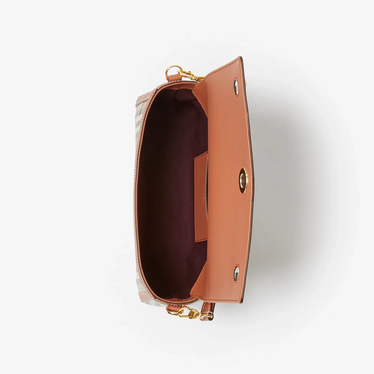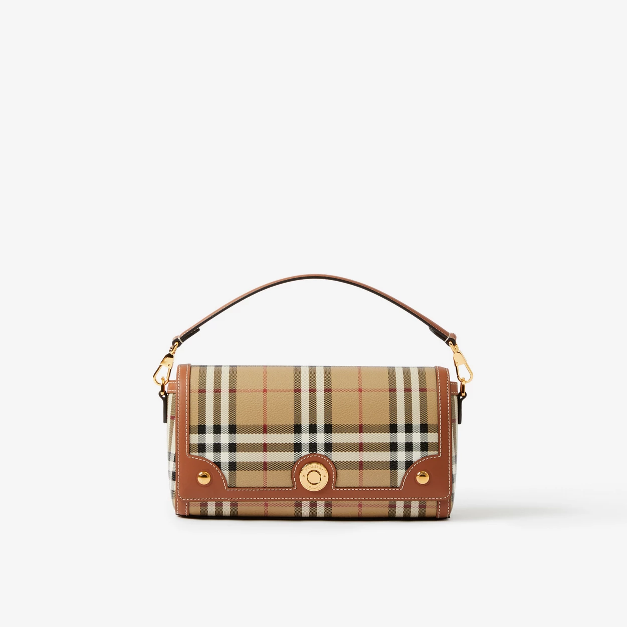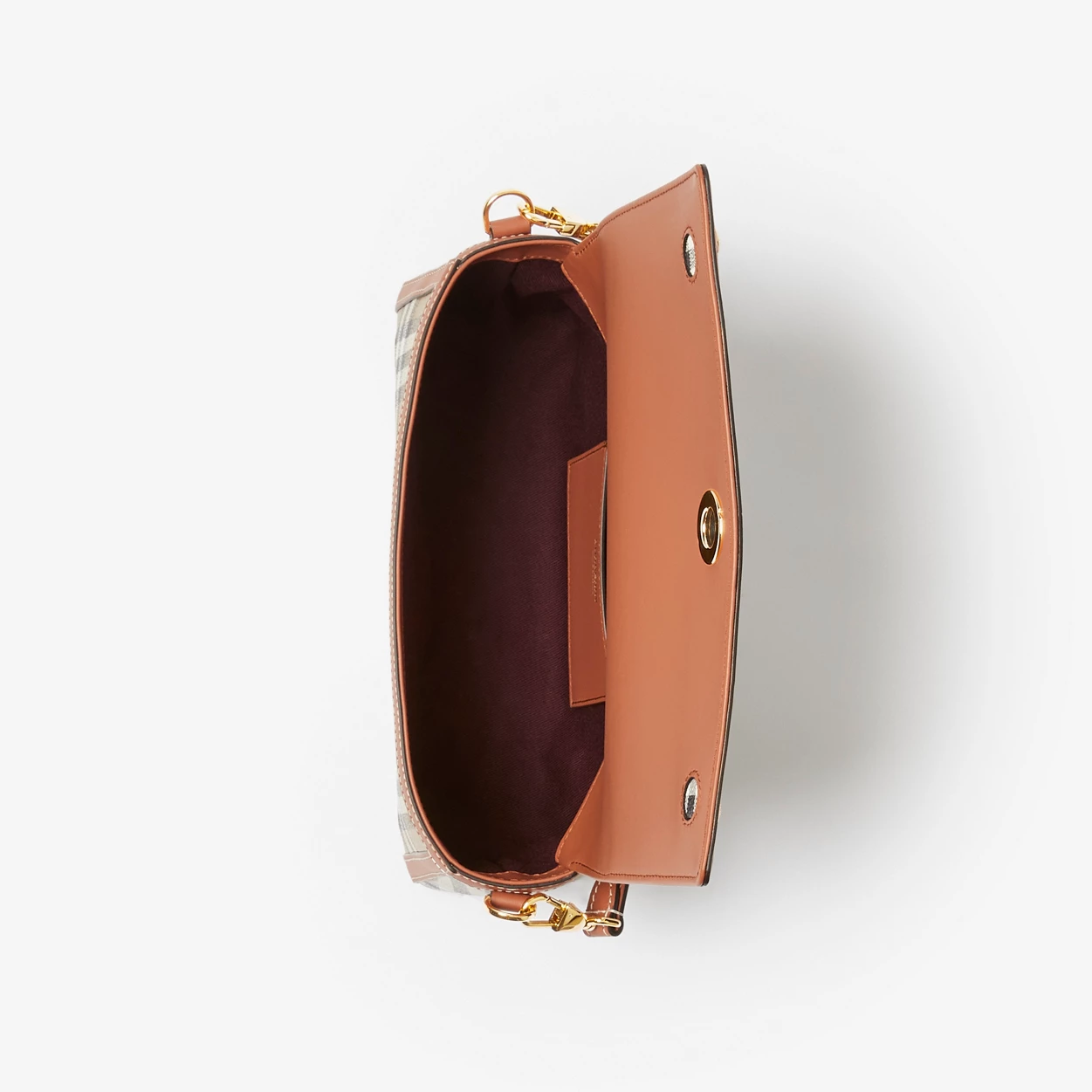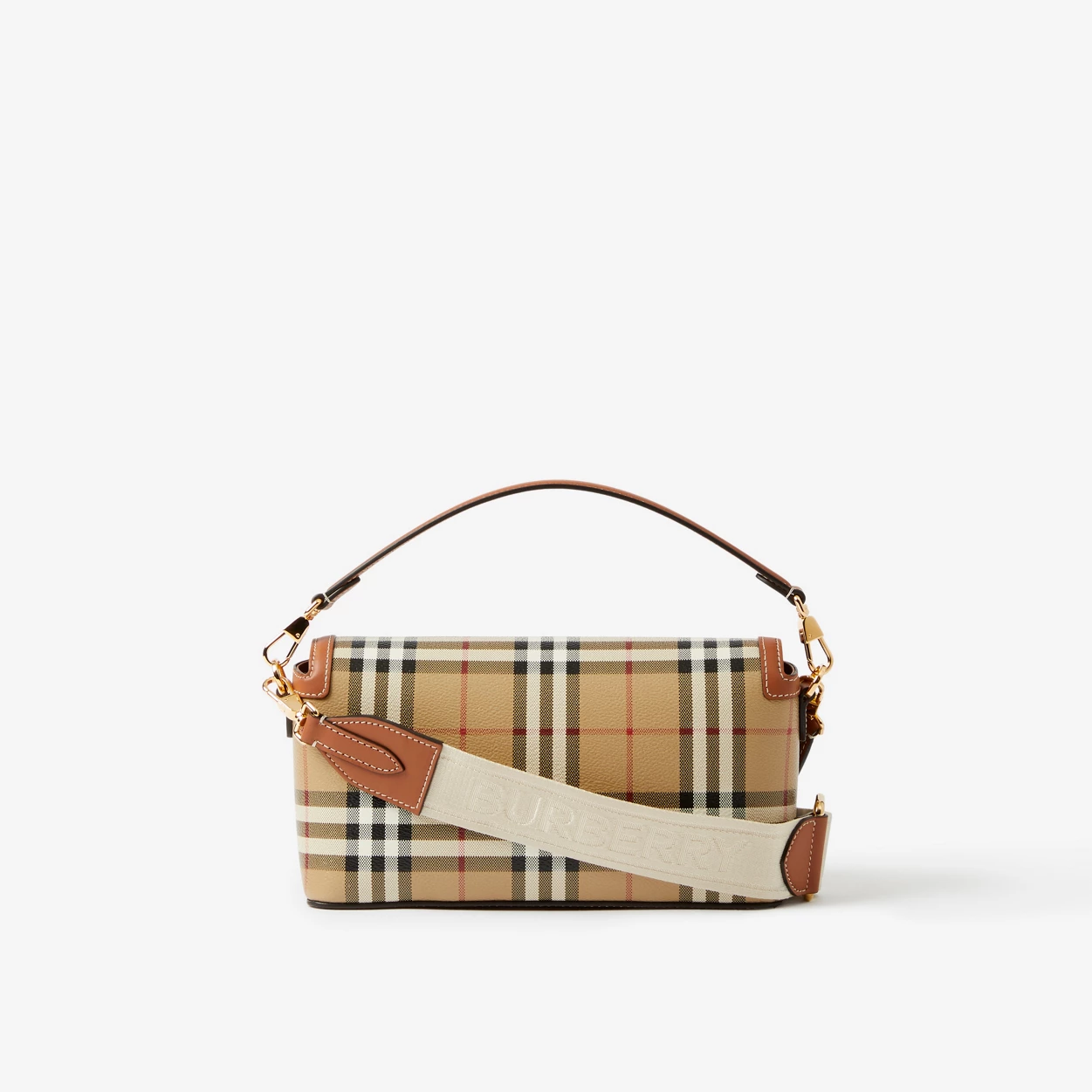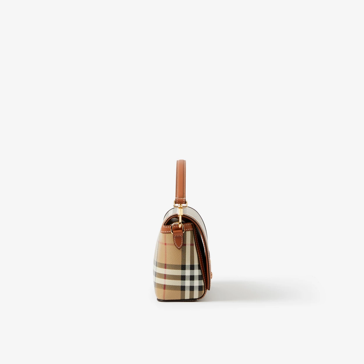 • A slim silhouette in Burberry Check and topstitched leather, accented with polished logo-engraved press studs. Carry by the top handle or adjustable crossbody strap, highlighted with jacquard-woven Burberry lettering. The main material of this product is made with at least 30% bio-based materials. Bio-based materials are derived from renewable natural resources such as plants and castor oil.