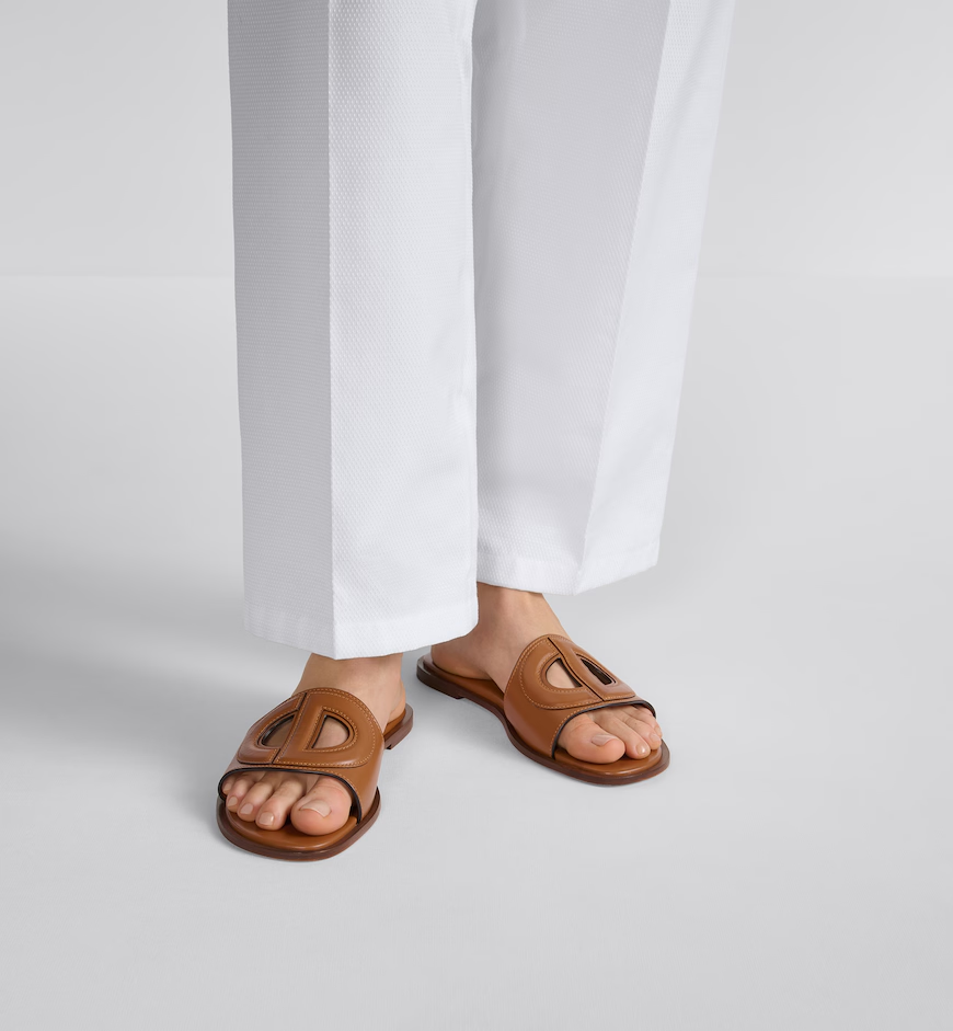 The D-Club slide has timeless and simple elegance. The camel calfskin upper with contrasting dyed edges is embellished with an openwork CD signature, creating a subtle 3D effect. The padded leather insole offers ultimate comfort while the minimalist design allows it to be easily slipped on to complete laid-back attire.