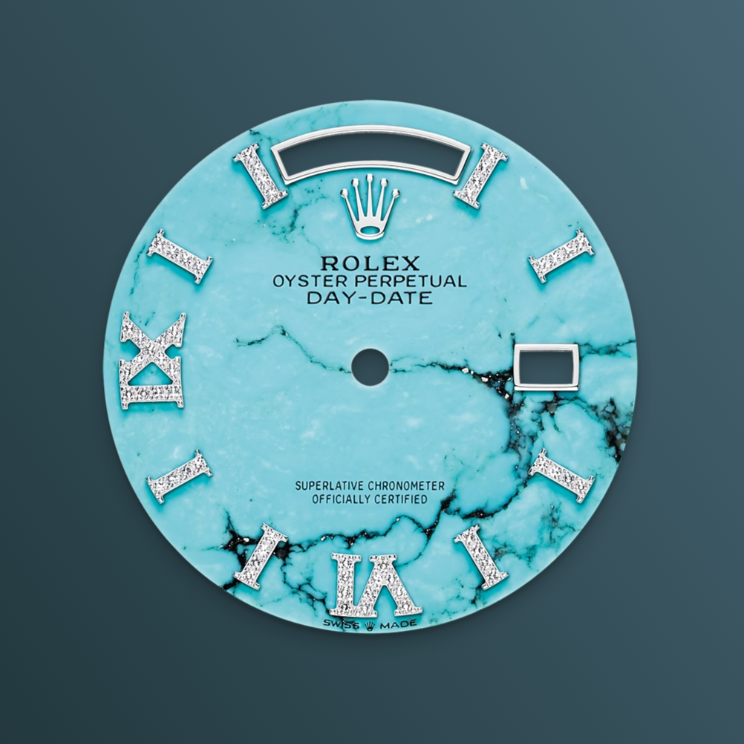 Turquoise is one of the few places on earth where only turquoise is produced and has been considered a treasure for thousands of years thanks to its unique hue. The beautiful structure of turquoise and its rare blue color, which also complements gold and white gold, made it the choice of Rolex. This material is only available for the Day-Date model in 36 gold or platinum.