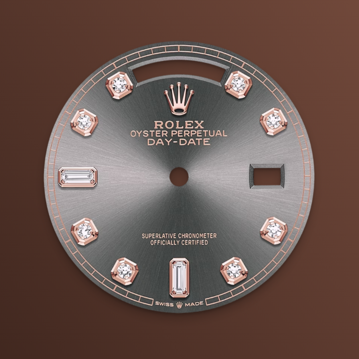 The Oyster Perpetual Day Date 36 in 18-carat eternal pink gold with diamond-set slate gray dial, diamond-set bezel and President strap.