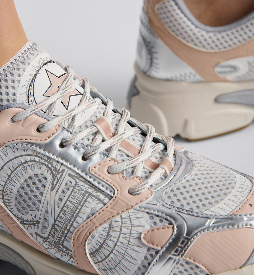 New for Fall 2024, the Dior Chrono sneaker revisits the running shoe with the House's couture codes. Pairing white mesh with nude and silver-tone laminated leather-effect panels, it is accented by hallmark details like the CD signature on the sides, a star patch on the tongue and a rear Dior signature. Featuring three-tone laces and an ultra-lightweight sole adorned with a star, the sneaker will complete laid-back outfits year-round.