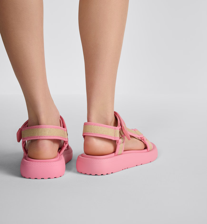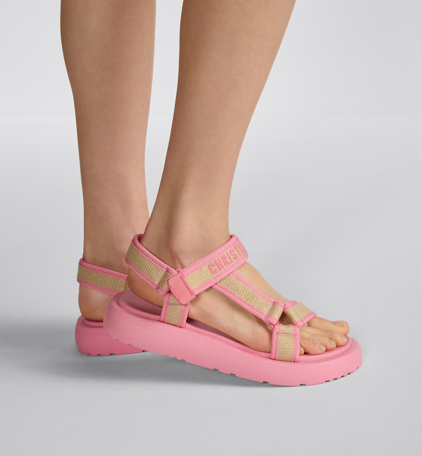 Part of the Dioriviera capsule, the D-Wave sandal displays a hybrid silhouette with a modern aesthetic. The adjustable self-fastening strap in natural raffia is enhanced by the Christian Dior signature embroidered in candy pink cotton. Completed by a thick, ultralightweight and comfortable sole, the sandal will lend a contemporary touch to seasonal looks and can be styled with other pieces from the Dioriviera capsule.