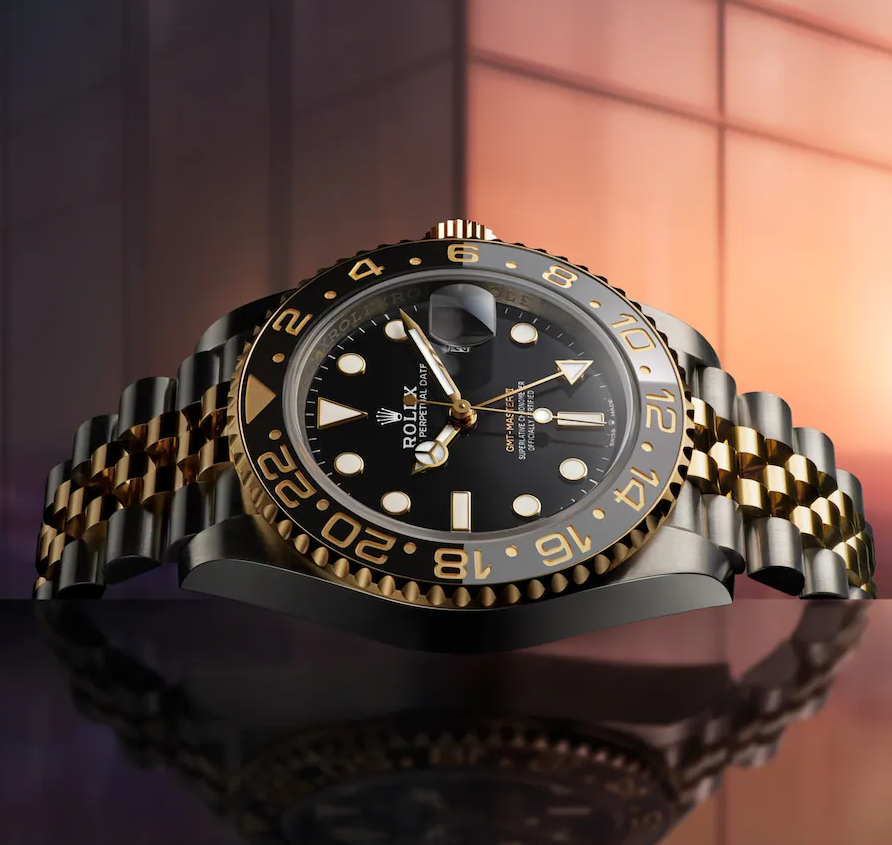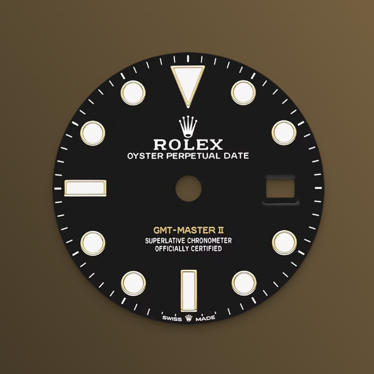 The GMT II is fitted with a Jubilee strap. Flexible and comfortable, the five-compartment link Jubilee strap was specially designed by Rolex for the Oyster Perpetual Logbook in 1945.