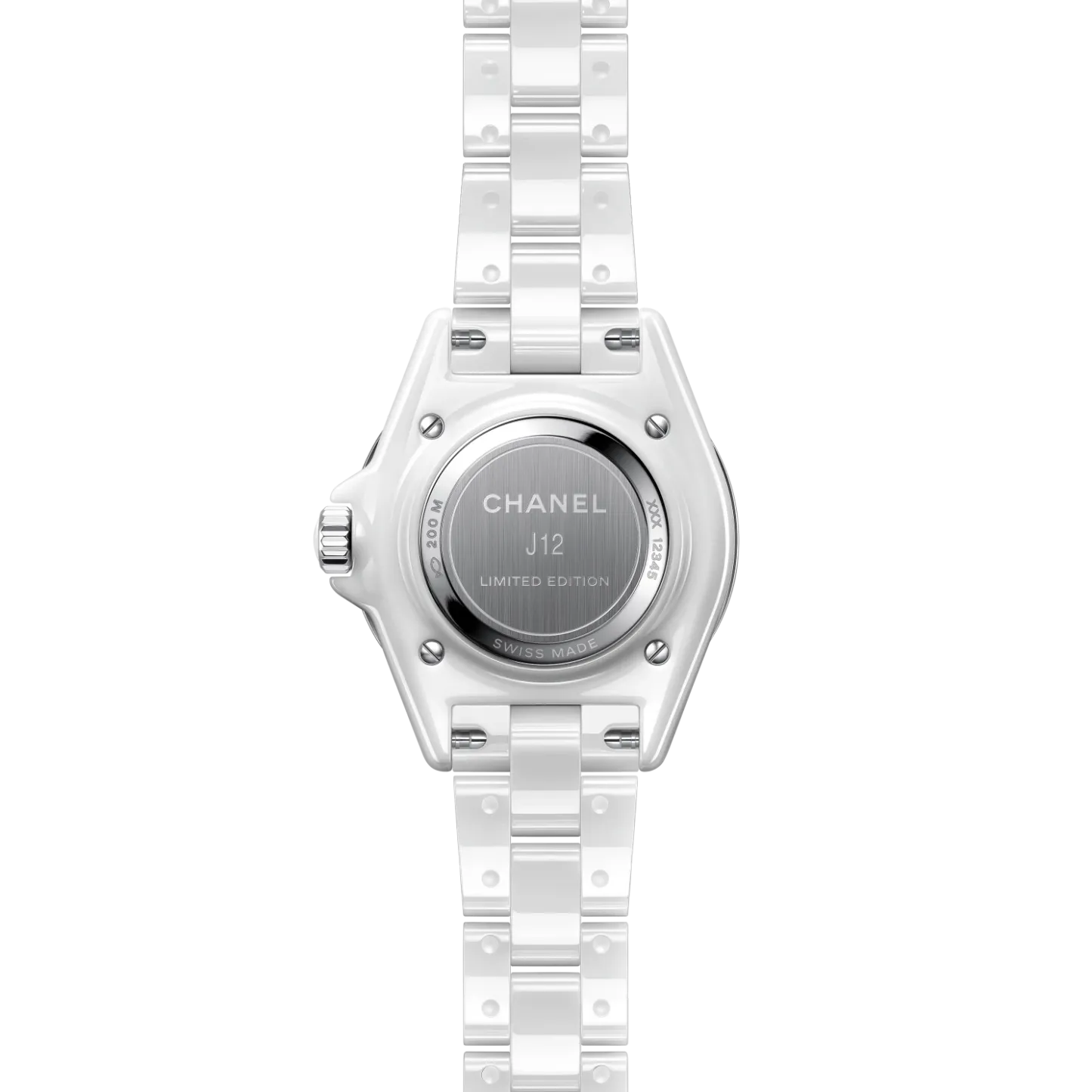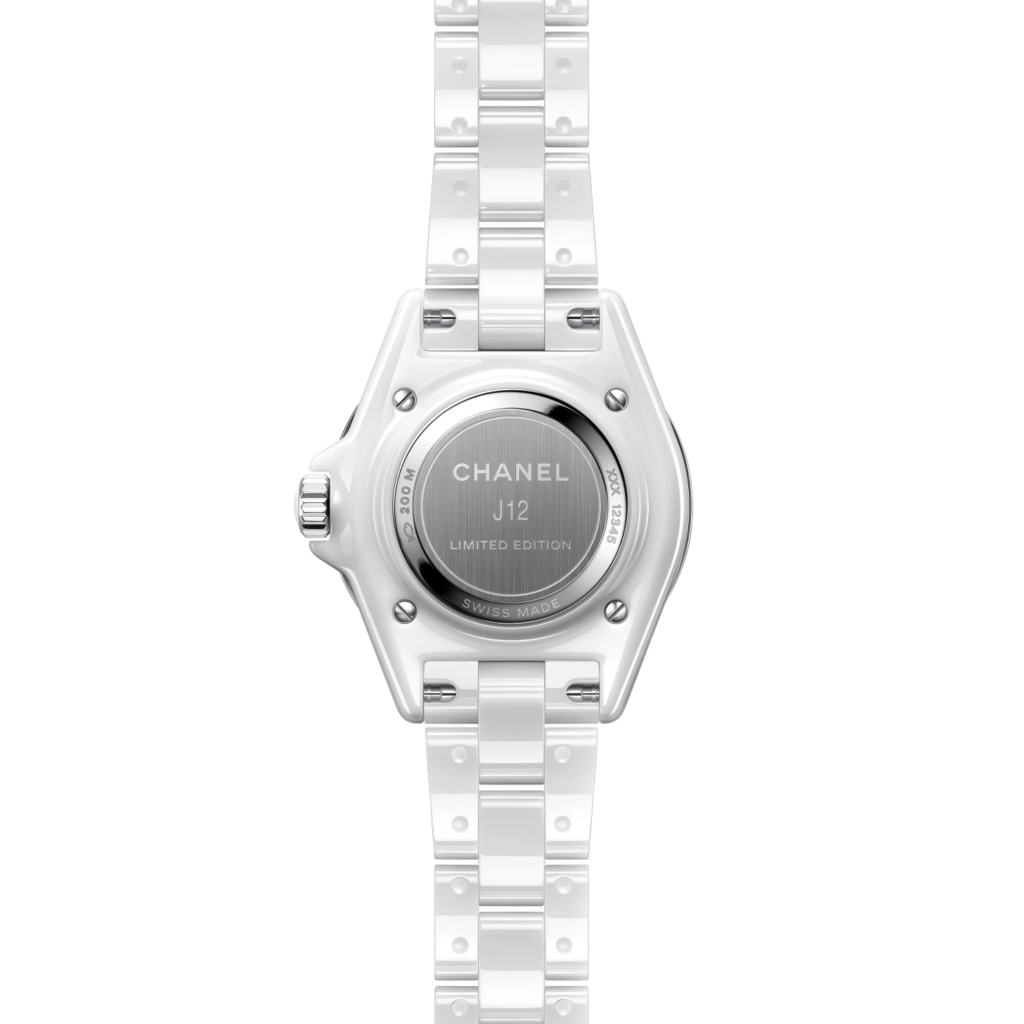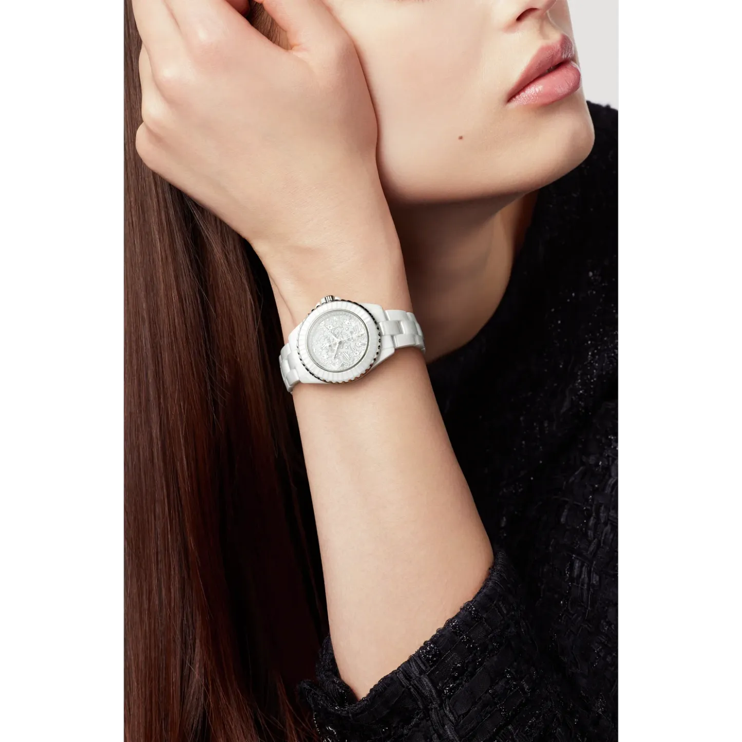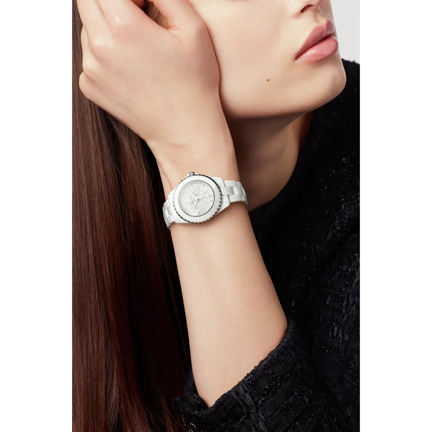 White dial with Super-LumiNova with blue luminescence, polished rhodium-plated stickers and 12 brilliant-cut diamonds (~0.01 carat)