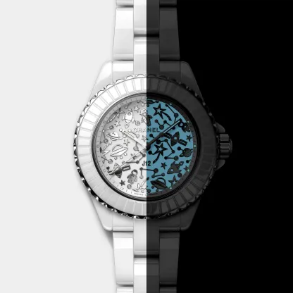 Steel fixed bezel with white-varnished sapphire crystal with baguette-cut pattern