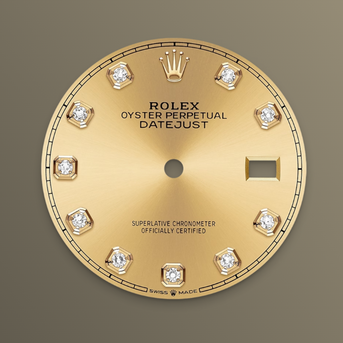 The dial is set with diamonds on an 18-carat gold base. Many of the dial models in the Oyster collection feature a sunray effect that reflects a light luster. This effect requires an exceptional brushing technique to create an engraving that extends outward from the center of the dial.