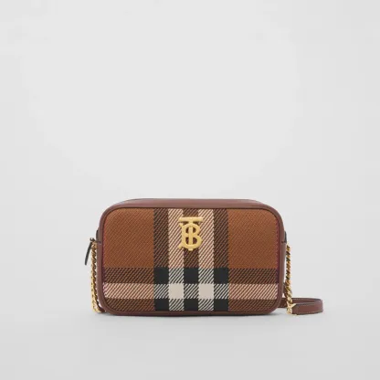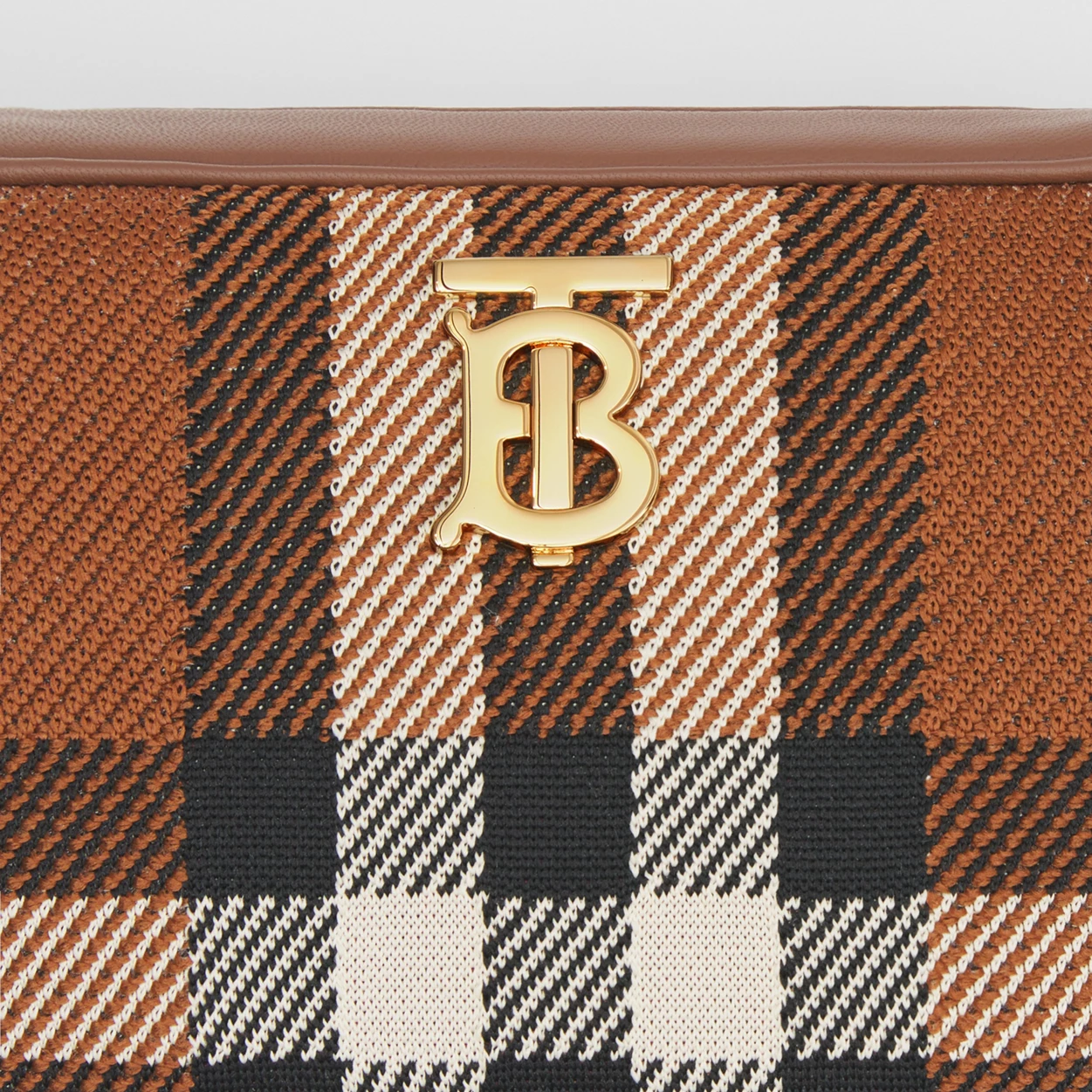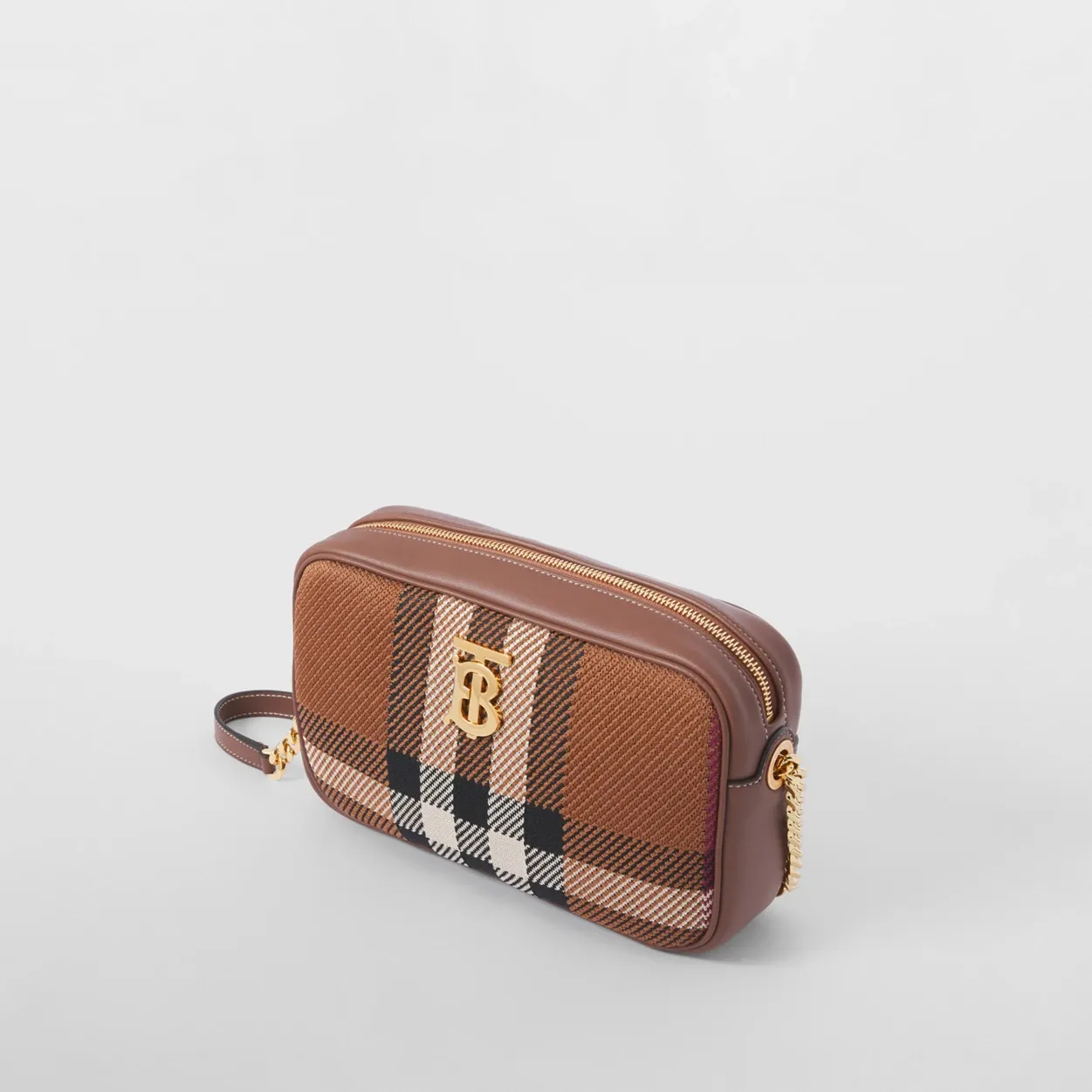 A softly structured camera bag in knitted Exaggerated Check and Italian-tanned topstitched leather, punctuated with a polished chain strap and the Thomas Burberry Monogram. Wear it on the shoulder or style as a crossbody.