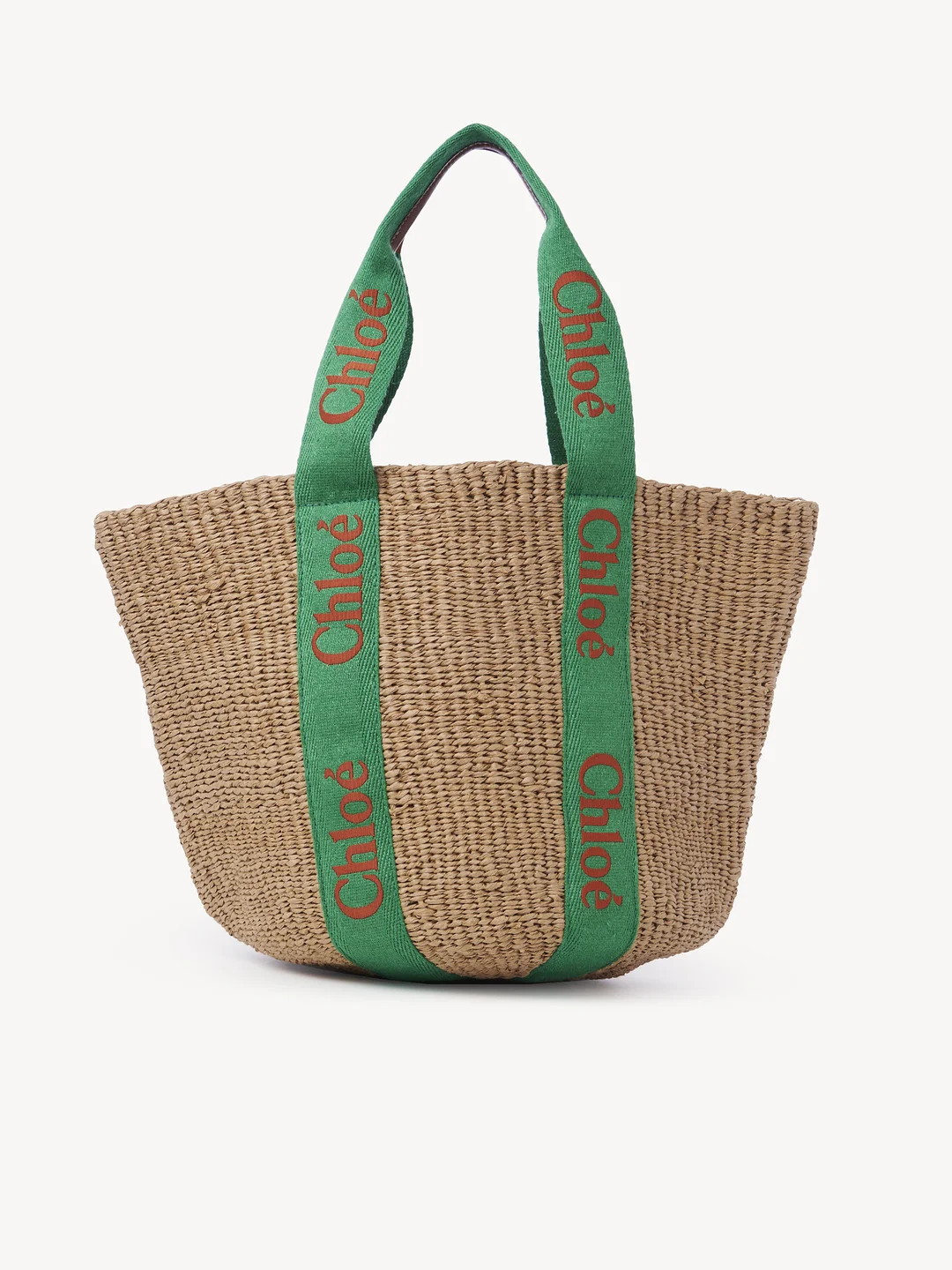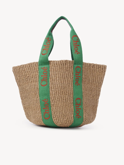 Crafted in a timeless basket shape for an effortless summer mood, this large Woody basket is handwoven from partly upcycled materials by independent craftswomen in Kenya. The brightly colored embroidered Chloé logo webbing details the natural fiber for graphic contrast and a signature touch. The bottom of the basket is protected by a Chloé-embossed round leather patch for durability.
