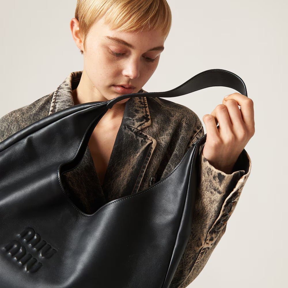 A sleek design, cosmopolitan charm, and distinctive details meet in this new leather hobo bag. The lettering logo on the front adds an iconic touch to the accessory while the Re-Nylon lining with zipper pocket completes the style with a refined detail.