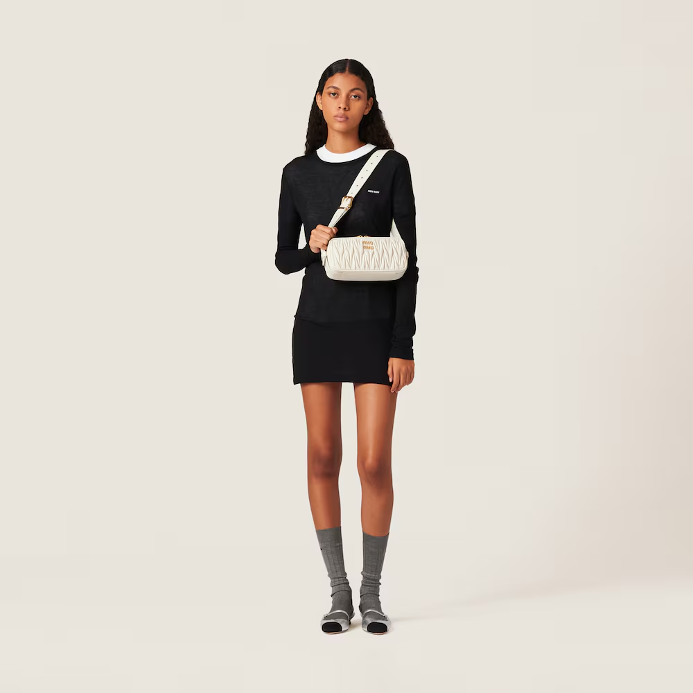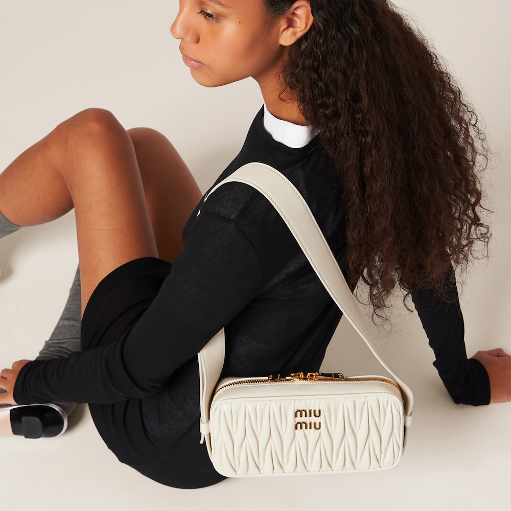 Precious matelassé workmanship reinterprets the feminine, compact and modern lines of this nappa leather handbag thanks to the three-dimensional, textured, and extremely sophisticated effect. The Miu Miu logo stands out with an iconic and instantly recognizable touch. The adjustable leather shoulder strap and refined lines make the design versatile, glamorous, and cosmopolitan.
