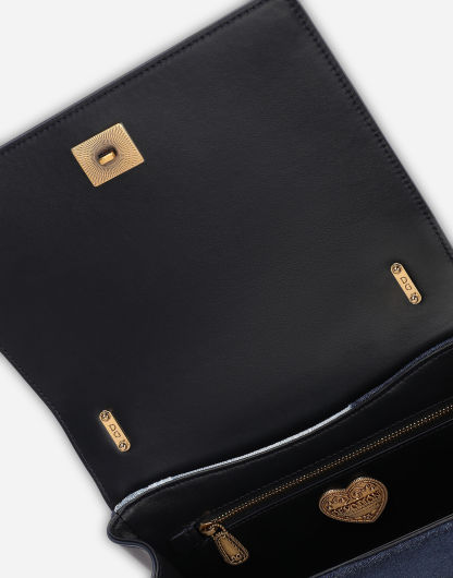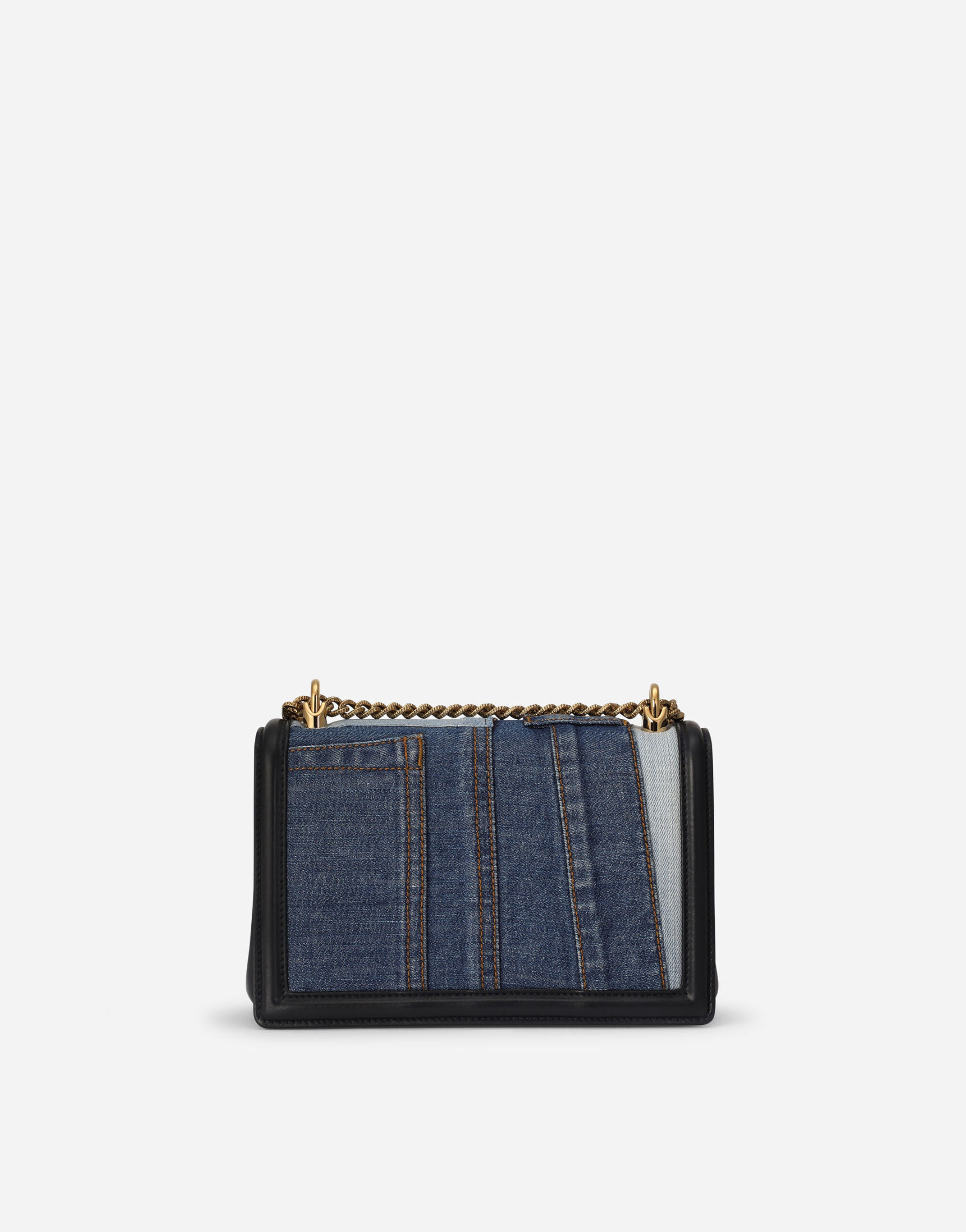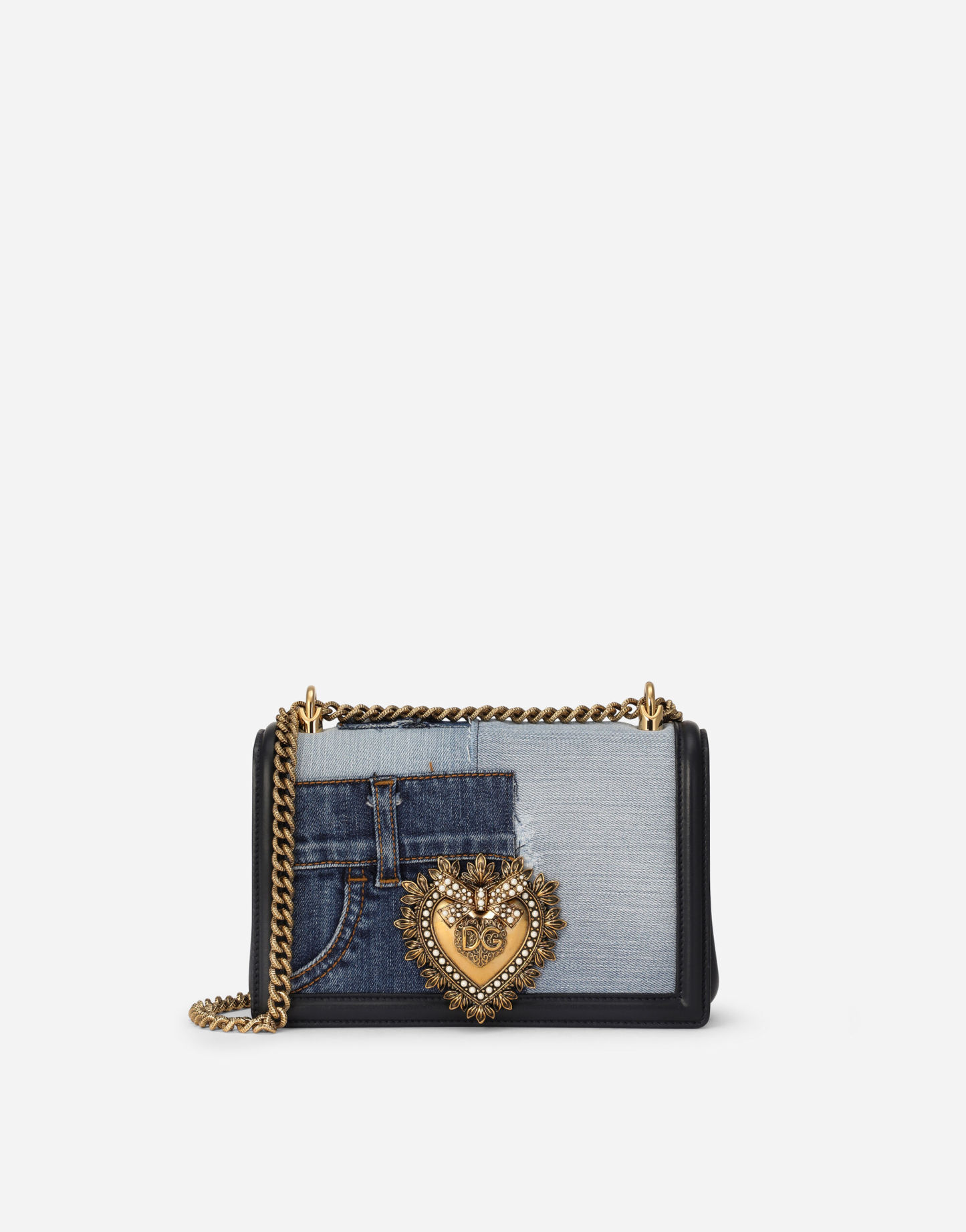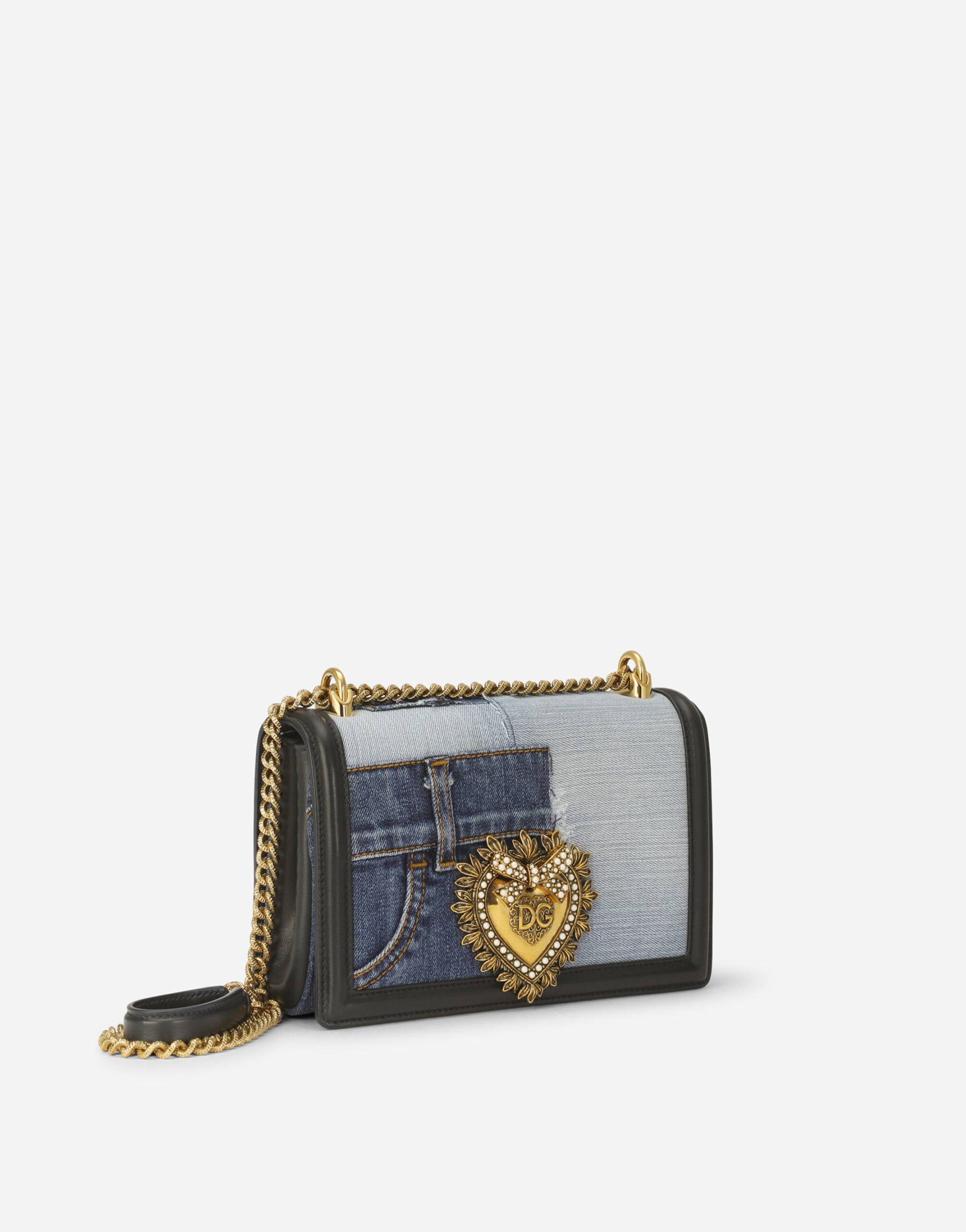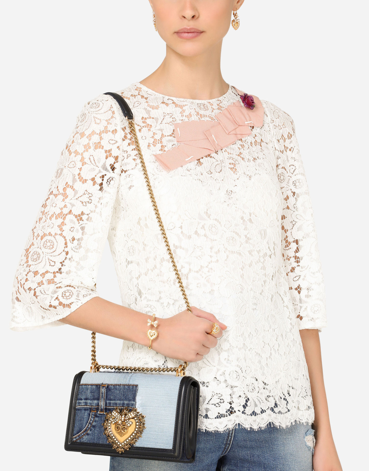 Craftsmanship and the handmade are the keys to this collection, which has been entrusted to the skilled hands of expert artisans, able to make every piece unique. This medium Devotion crossbody bag comes in patchwork denim and plain calfskin. It is distinguished by the exclusive bejeweled heart fastening and the shoulder strap inspired by the techniques of high quality jewelers.