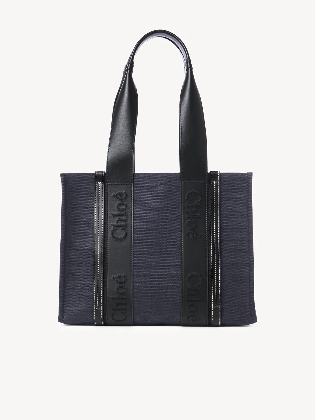 The bag's sharp, modern lines are emphasized by the vertical leather strips and the signature Chloé logo carried over from the Woody mule and revisited in tonal embroidery on calfskin. Carry this tote bag comfortably on the shoulder.