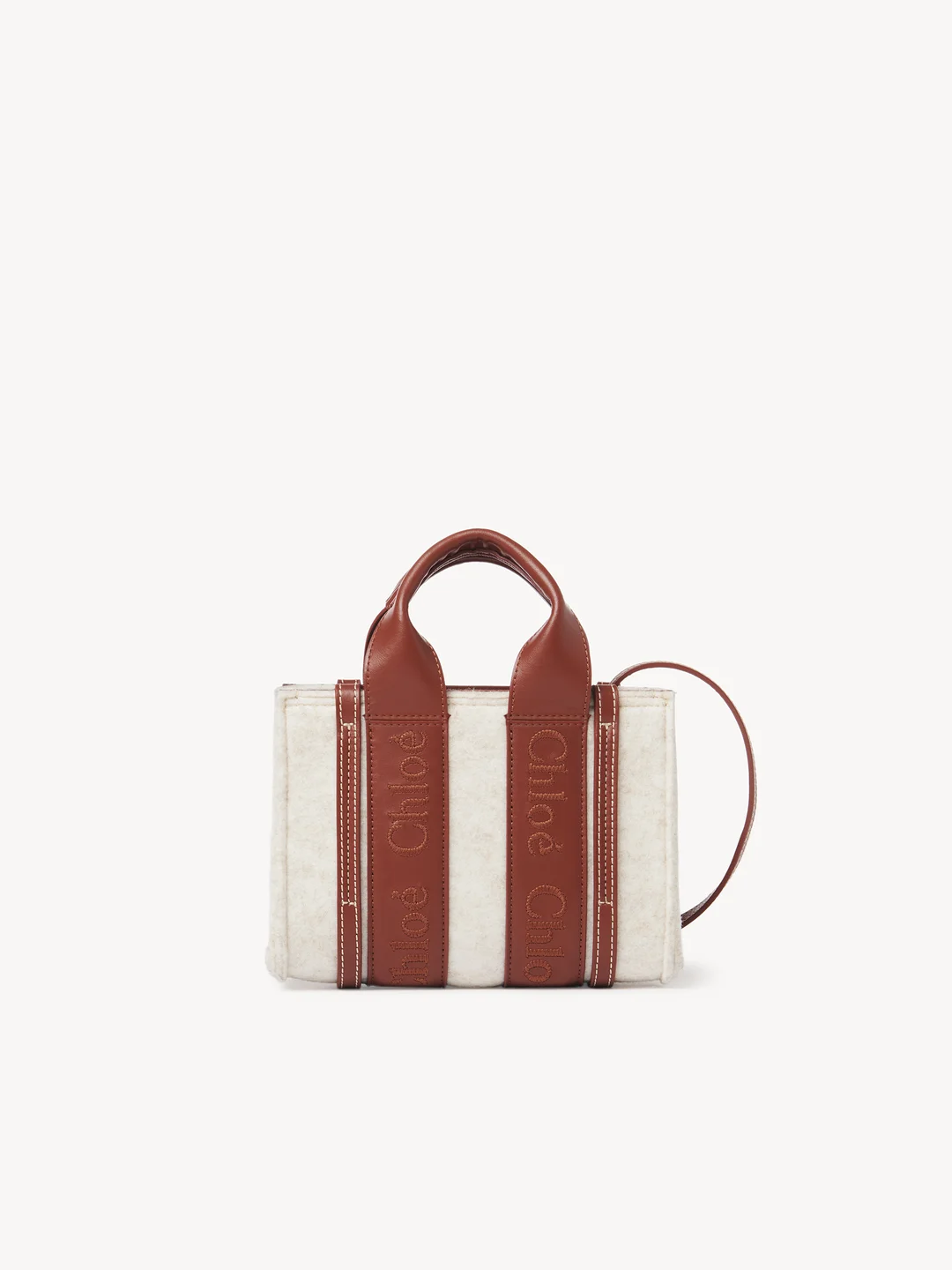 Crafted from recycled polyester felt detailed with shiny calfskin strips, this mini Woody tote bag is a compact bag with a strong winter attitude. The main compartment fits a mobile phone.