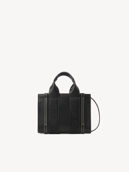 The Woody line is characterized by the signature Chloé logo carried over from the Maison's iconic mules. It showcases a modern, minimalist silhouette ranging from nano to large sizes.