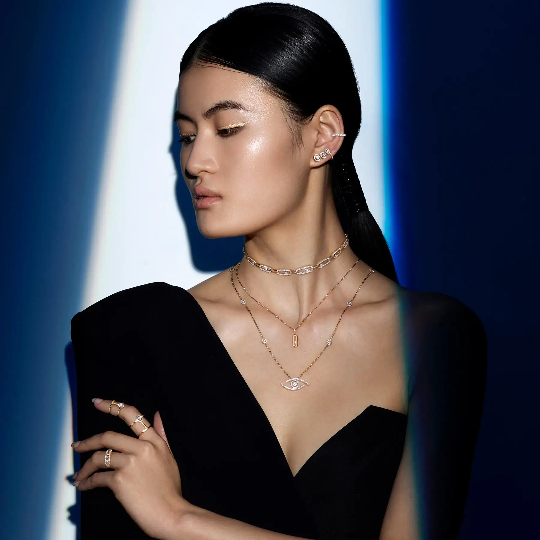 In jewelry, a strong design is one that transcends fashions, it is transgenerational while being individual, and is a symbol of established femininity. The new Move Uno choker in yellow gold and diamonds, which features Messika's iconic motif, is part of this philosophy. Set with sparkling diamonds, this diamond necklace for women will illuminate your evening outfits with luxurious radiance. The suppleness of its fastening, like a gold chain around the neck, will surprise you so much that you will want to wear it during the day to add character to your t-shirts or shirts.