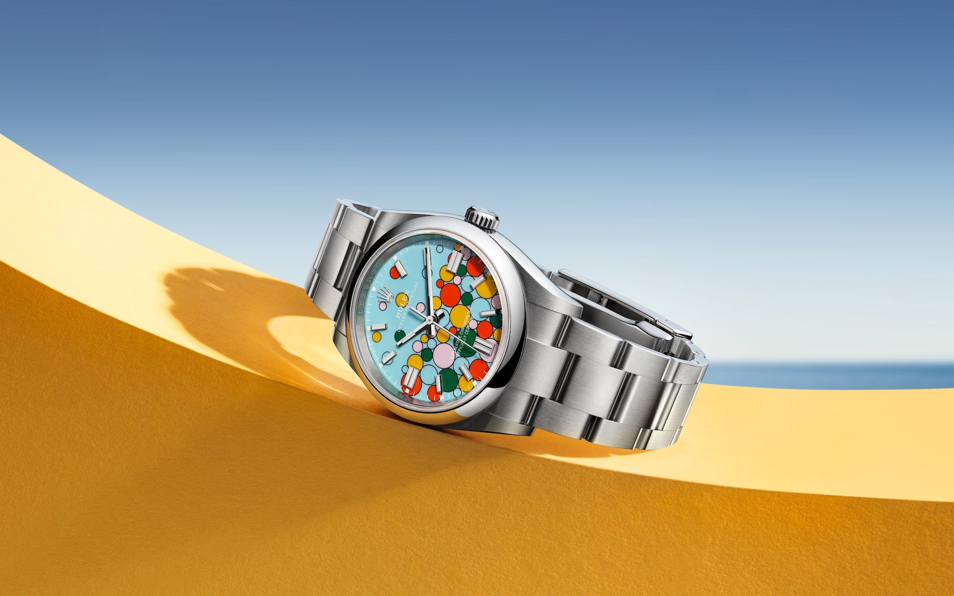 This motif consists of bubbles of varying sizes in a turquoise blue background with black circles filled with candy pink, yellow, coral red or green, recreating the bright colors of the lacquered dial of the 2020 model.