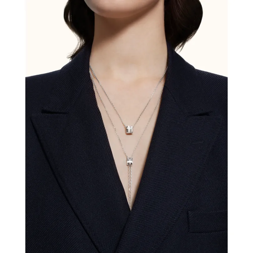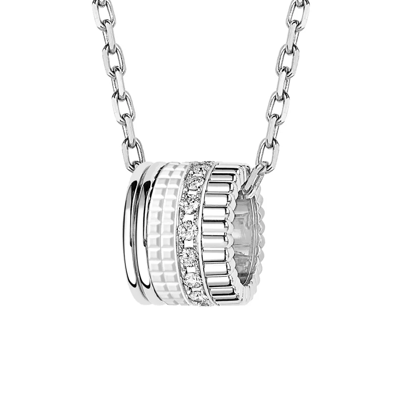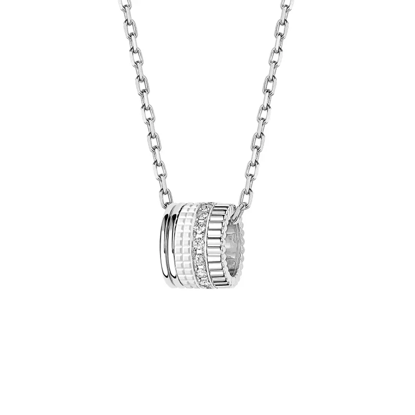 Quatre Double White Edition takes the form of a pendant. Matte white Hyceram, sparkling diamonds, polished white gold, the contrast of materials reinforces its graphic design. The monochrome shine of this necklace asserts your style in complete freedom.