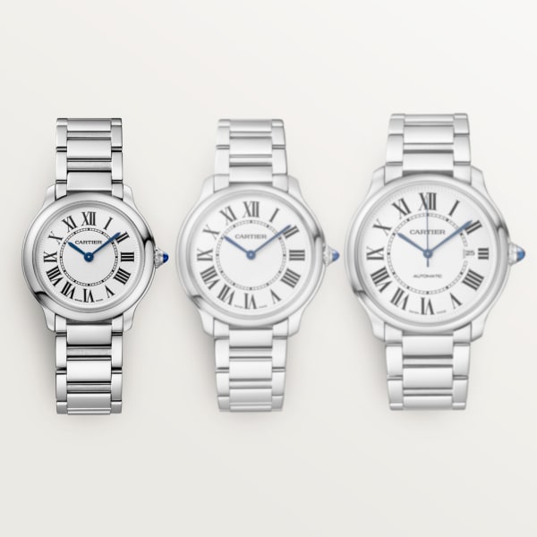 Roman numerals, blue apple-shaped hands, winding mechanism crowned with a sapphire and rail-track minute circle: the Ronde Louis Cartier watch is a classic timepiece by Cartier.
