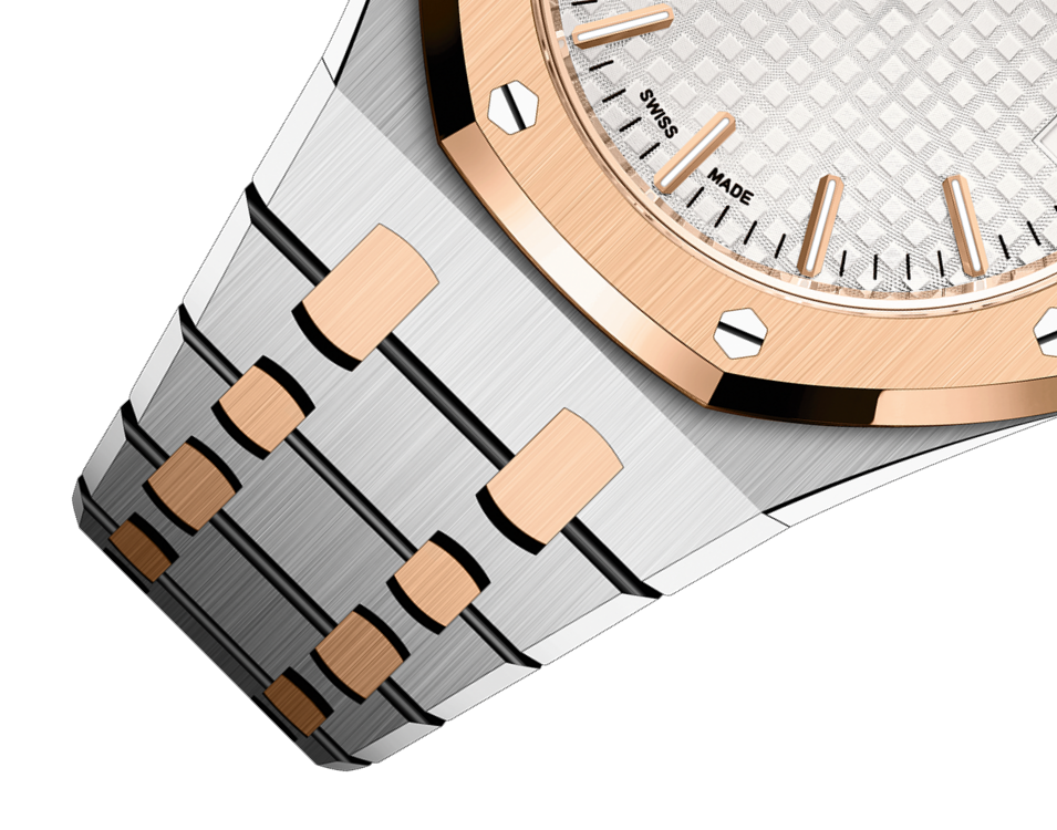 This 37 mm timepiece is endowed with a two-tone case marrying stainless steel with 18-carat pink gold and a silver-toned "Grande Tapisserie" dial. It also encompasses the latest Royal Oak design evolution and the selfwinding Calibre 5900.