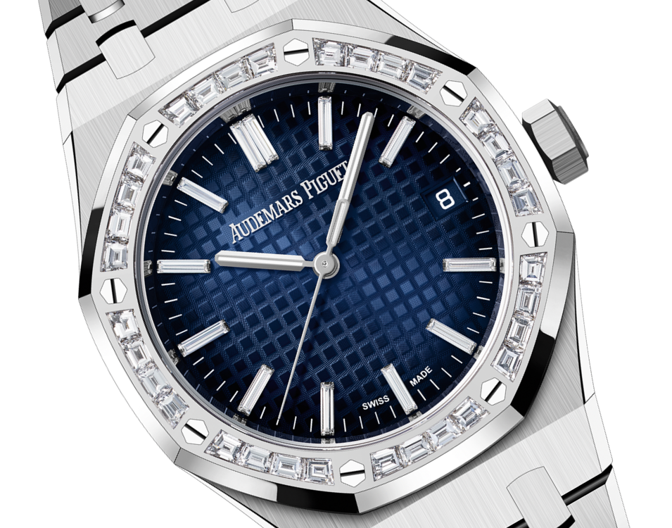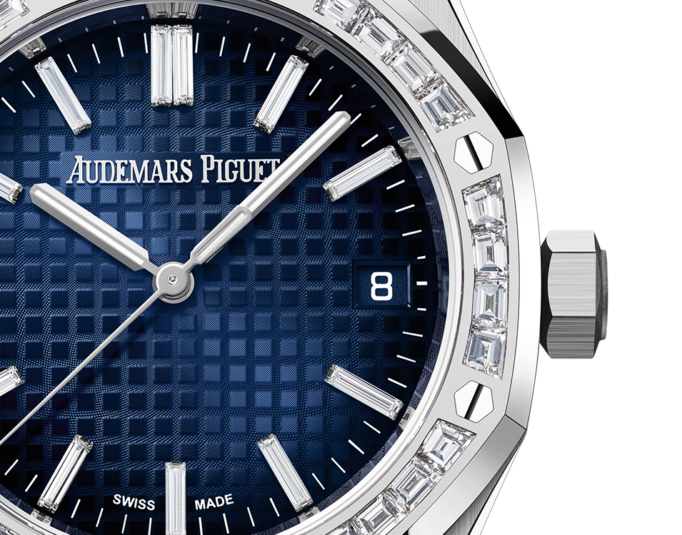 Smoked blue dial with "Grande Tapisserie" pattern, baguette-cut diamond hour-markers, white gold Royal Oak hands with luminescent coating.
