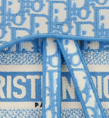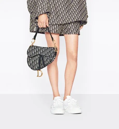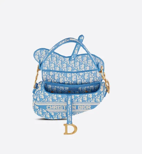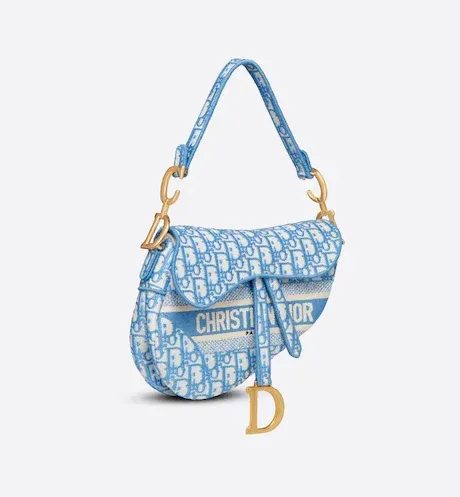 Maria Grazia Chiuri brings a fresh update to the iconic Saddle bag. The design is fully embroidered with the House's hallmark blue Dior Oblique motif. The legendary style features a Saddle flap with a magnetic 'D' stirrup clasp and boasts an antique gold-finish metal 'CD' signature on each side of the handle. The bag can be carried by hand or worn over the shoulder and may be customized with different shoulder straps.