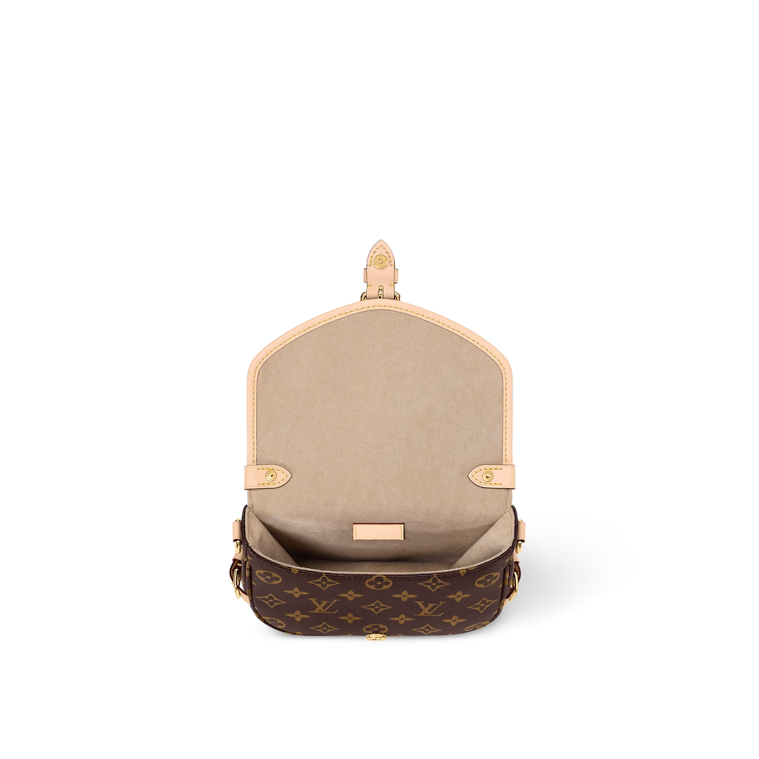 The Saumur BB handbag in Monogram canvas reimagines a beloved archival design in contemporary style. The saddle-bag shape and natural cowhide-leather buckles evoke an equestrian spirit, but the front buckle conceals a magnetic closure: a convenient modern touch. With room inside for a day's essentials, this compact bag is versatile too, thanks to the detachable strap and handle.