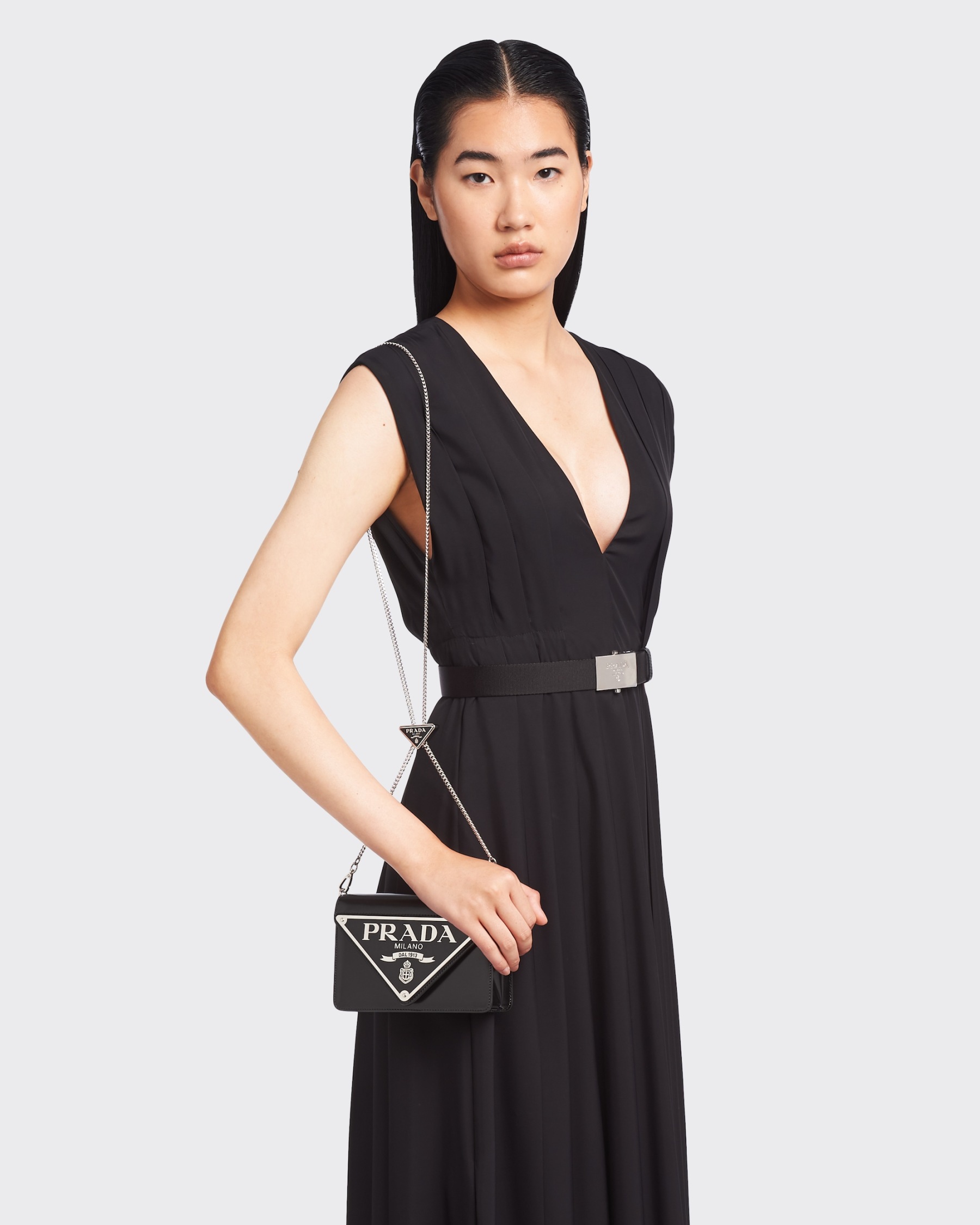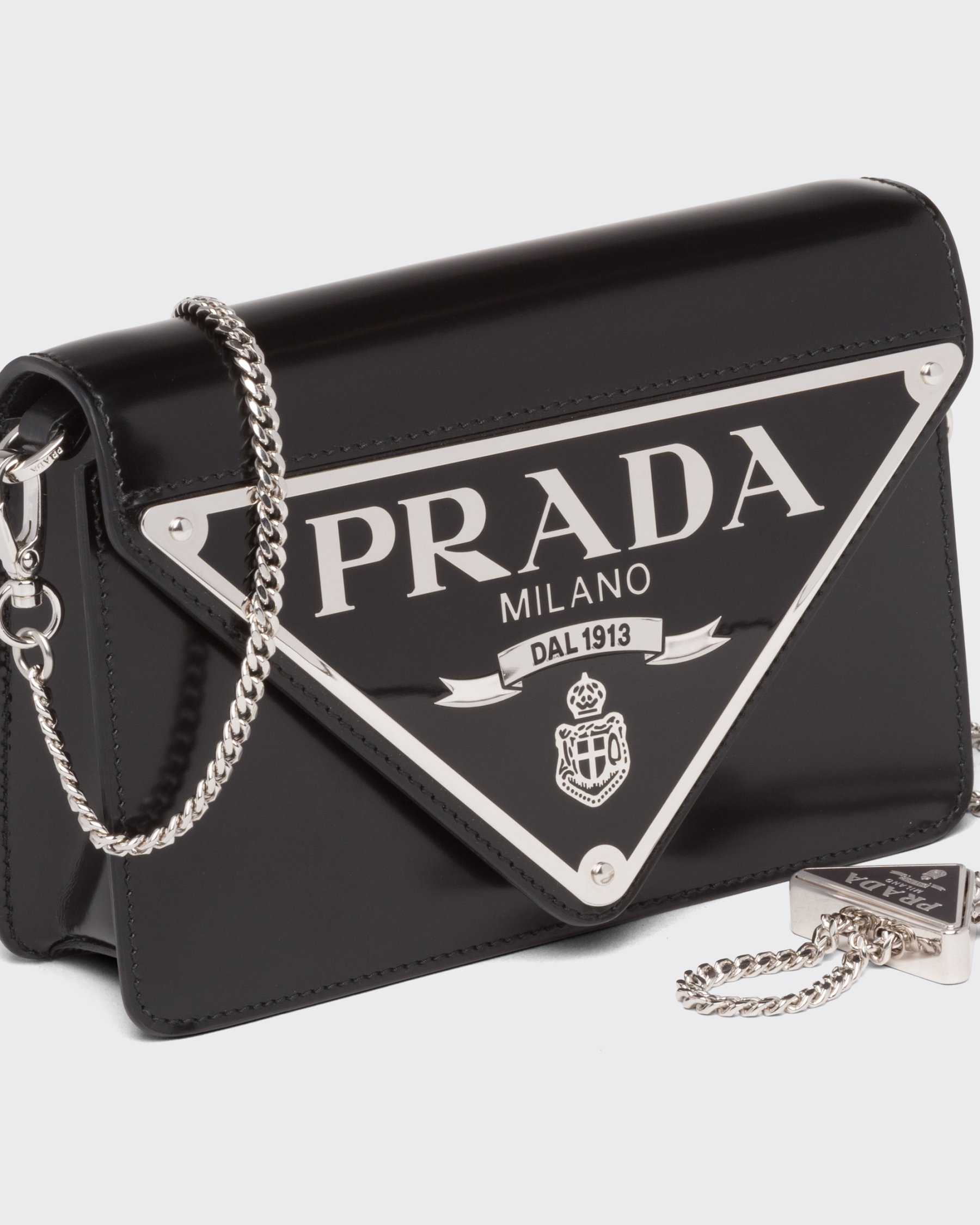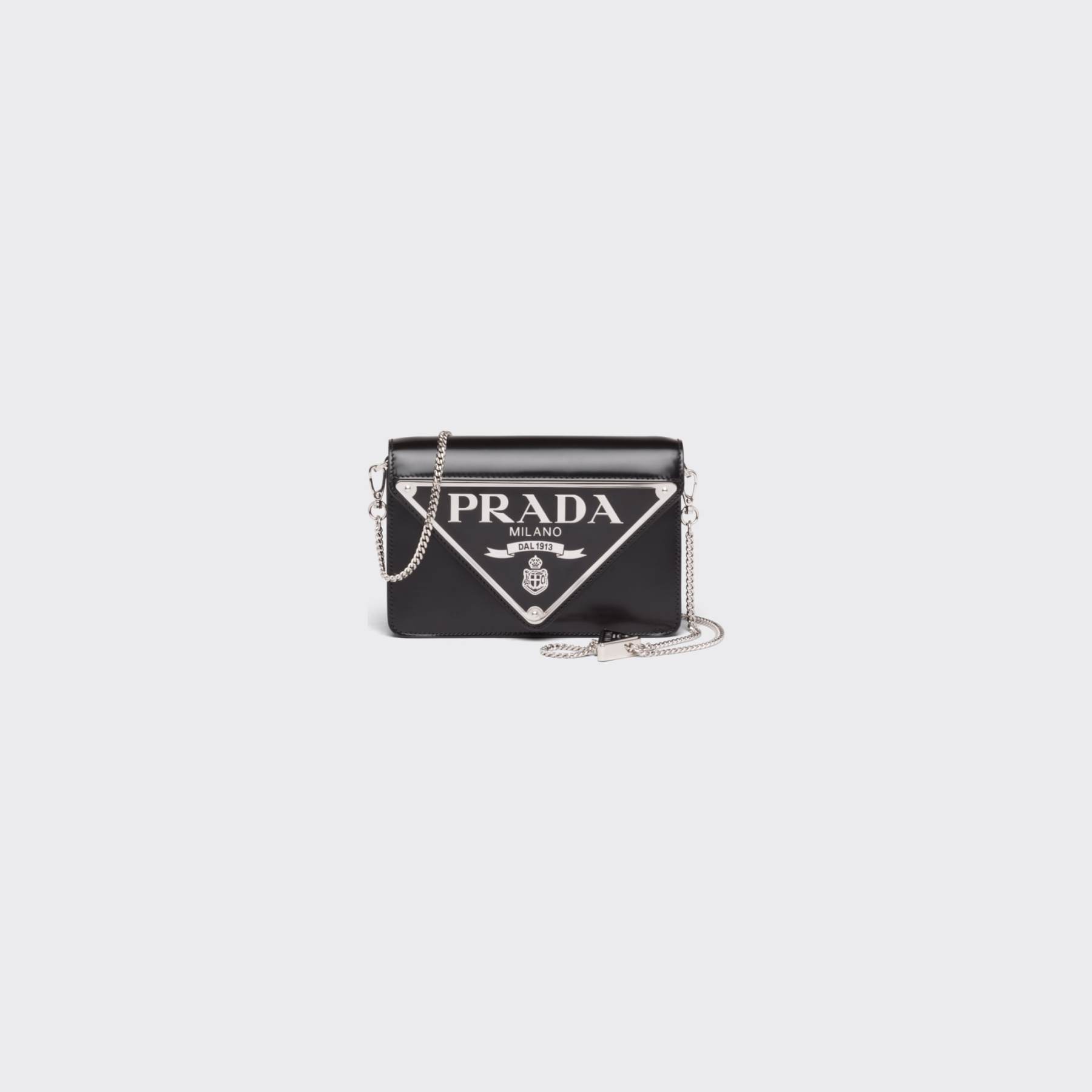 Originally adorned on a suitcase designed by Mario Prada, the triangular logo has since been reinterpreted in different styles, inspiring new geometric shapes, carrying conceptual connotations, and each collection is new.This simple shoulder bag is accented with a large enameled metal logo for a distinctly modern finish.