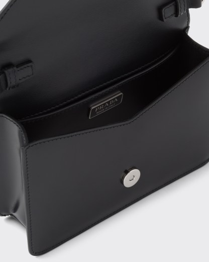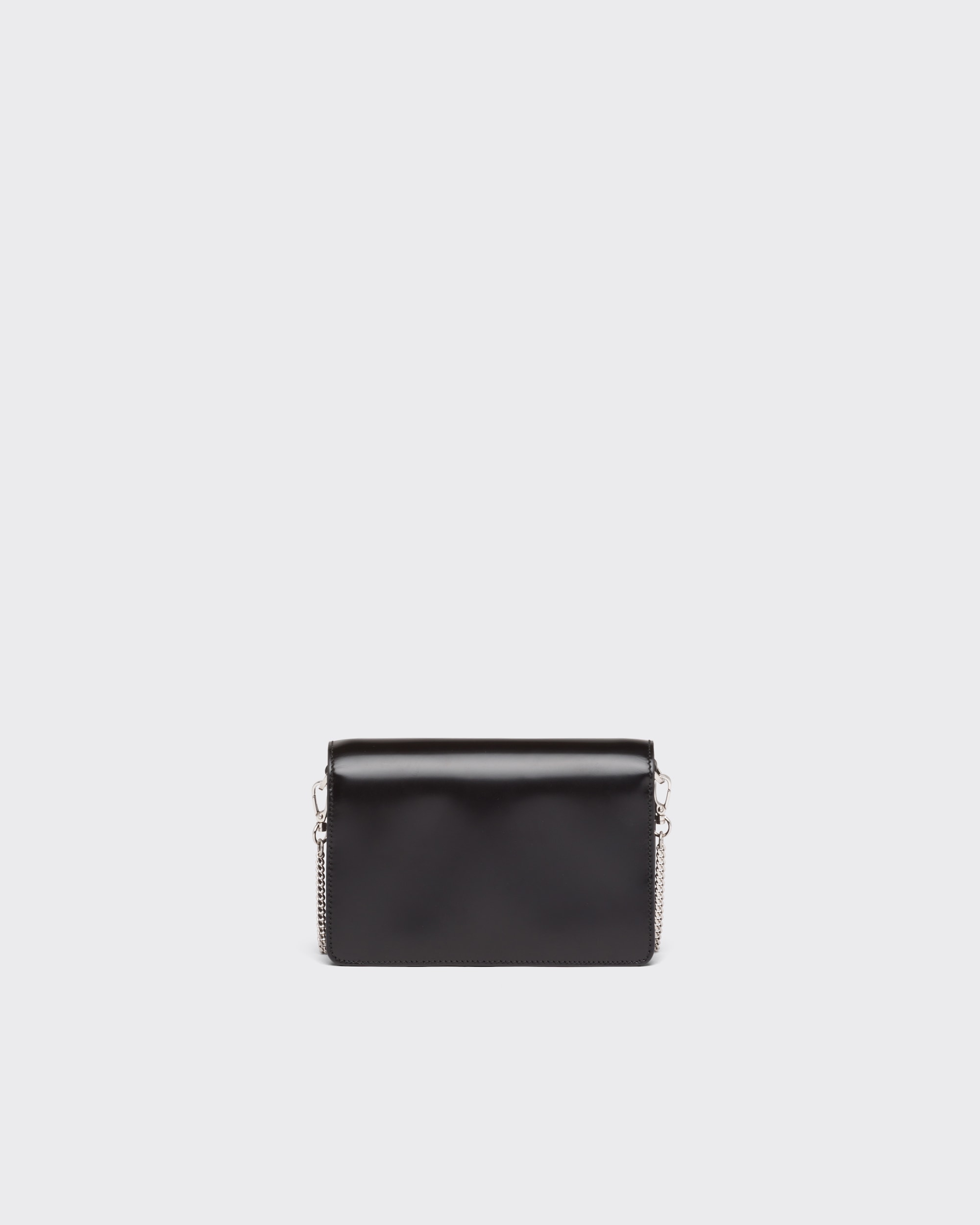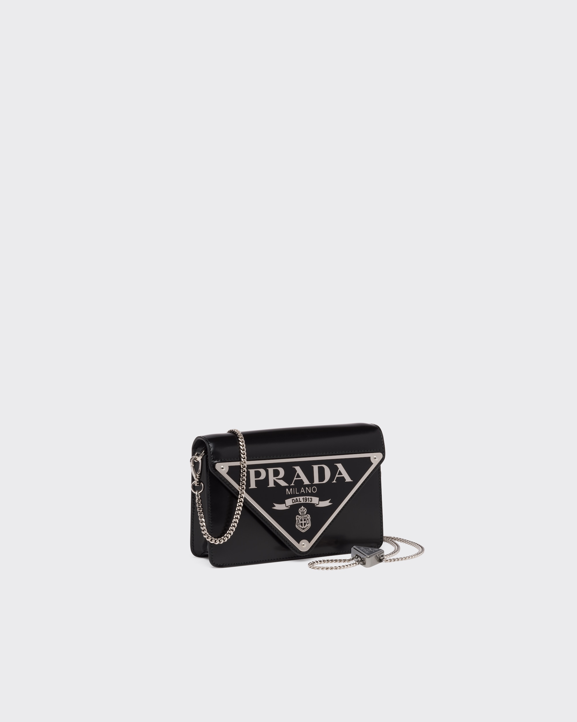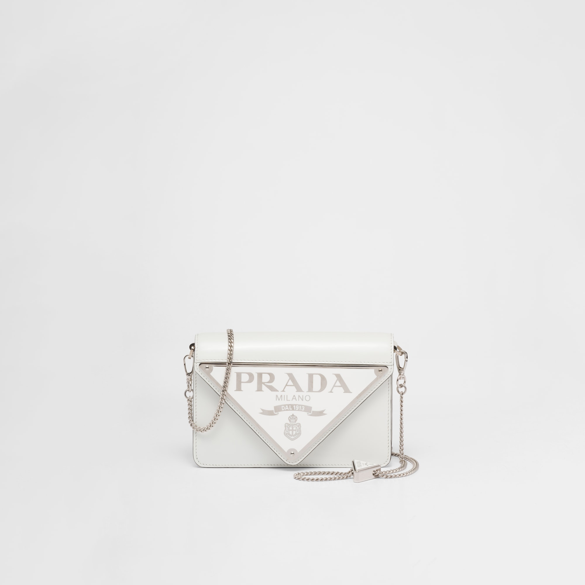 Originally adorned on a suitcase designed by Mario Prada, the triangular logo has since been reinterpreted in different styles, inspiring new geometric shapes, carrying conceptual connotations, and each collection is new.This simple shoulder bag is accented with a large enameled metal logo for a distinctly modern finish.