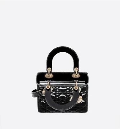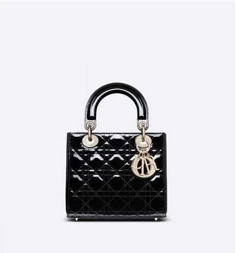 The Lady Dior handbag epitomizes Dior's vision of elegance and beauty. A sleek, refined bag, it is timeless yet modern. Crafted in black patent calfskin and covered with Cannage stitching, its supreme quilted texture instantly stands out. The pale gold-finish metal 'D.I.O.R.' charms further embellish its silhouette. The small style features a thin, removable leather shoulder strap and can be carried by hand, worn over the shoulder or crossbody.