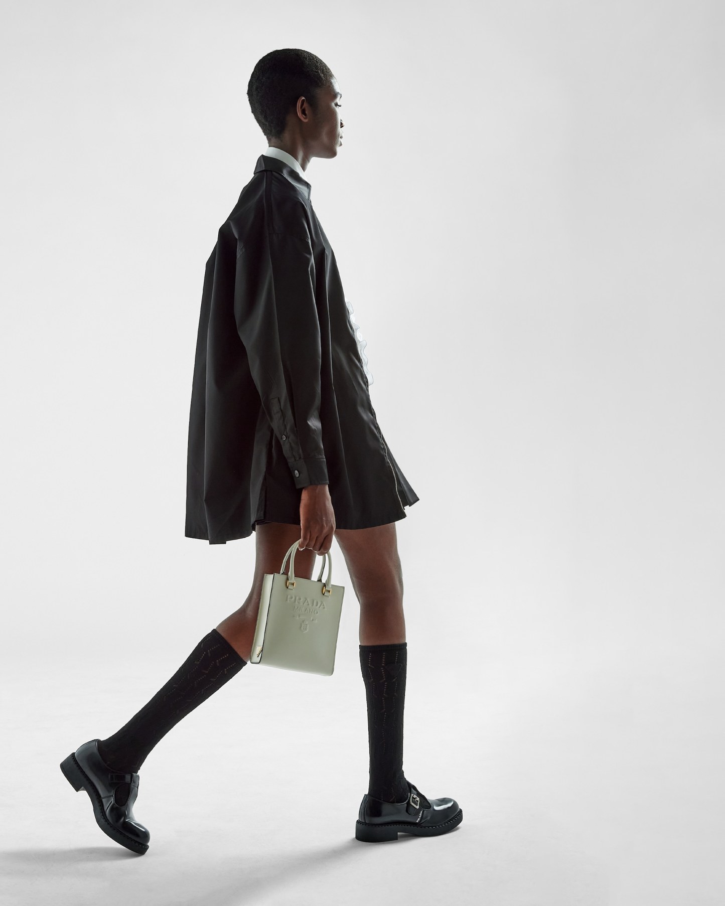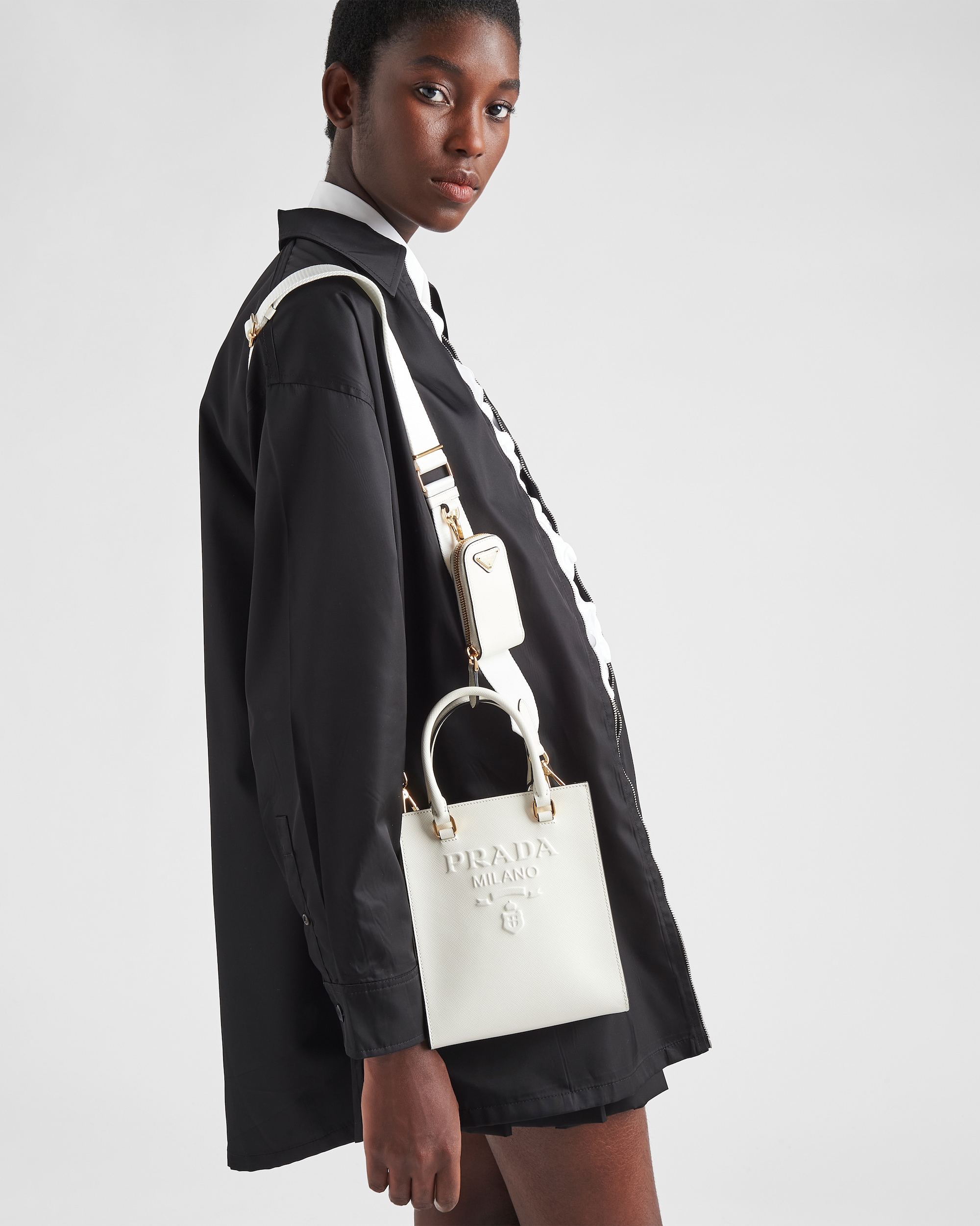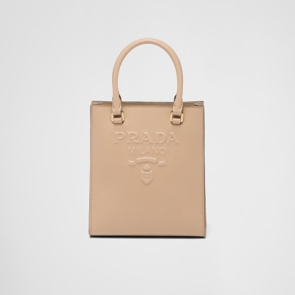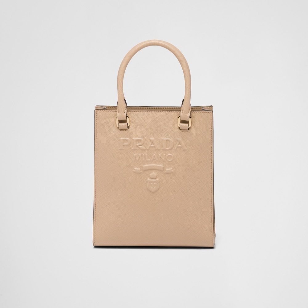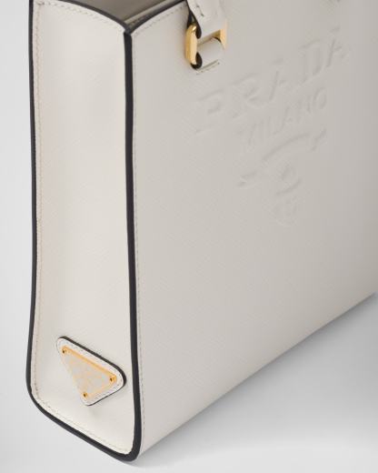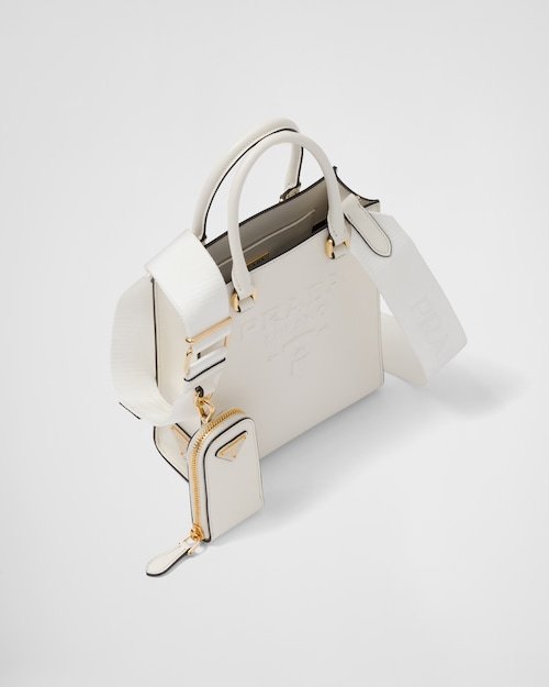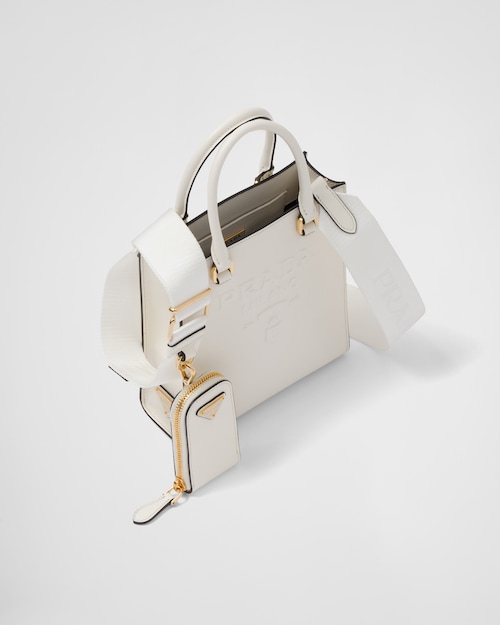 Saffiano leather, Prada's iconic material, is synonymous with luxury and identifies with traditional Italian leather-making. This high-quality leather with its characteristic crosshatch texture and waxed finish defines this handbag with a sleek, elegant design, double handle, and detachable shoulder strap that allows it to be worn in different ways. Decorated with the embossed lettering logo, the design has a detachable pouch for a contemporary accent.