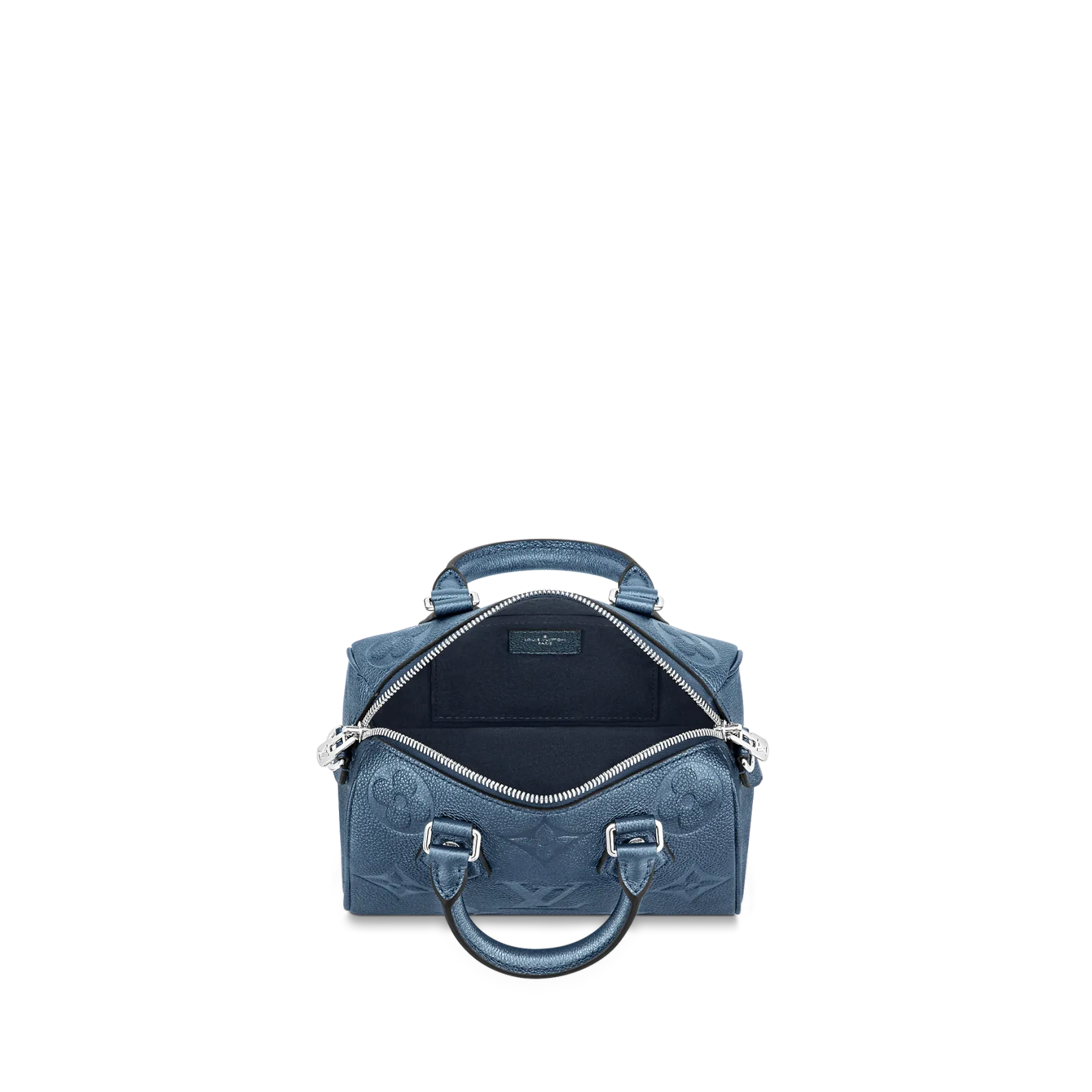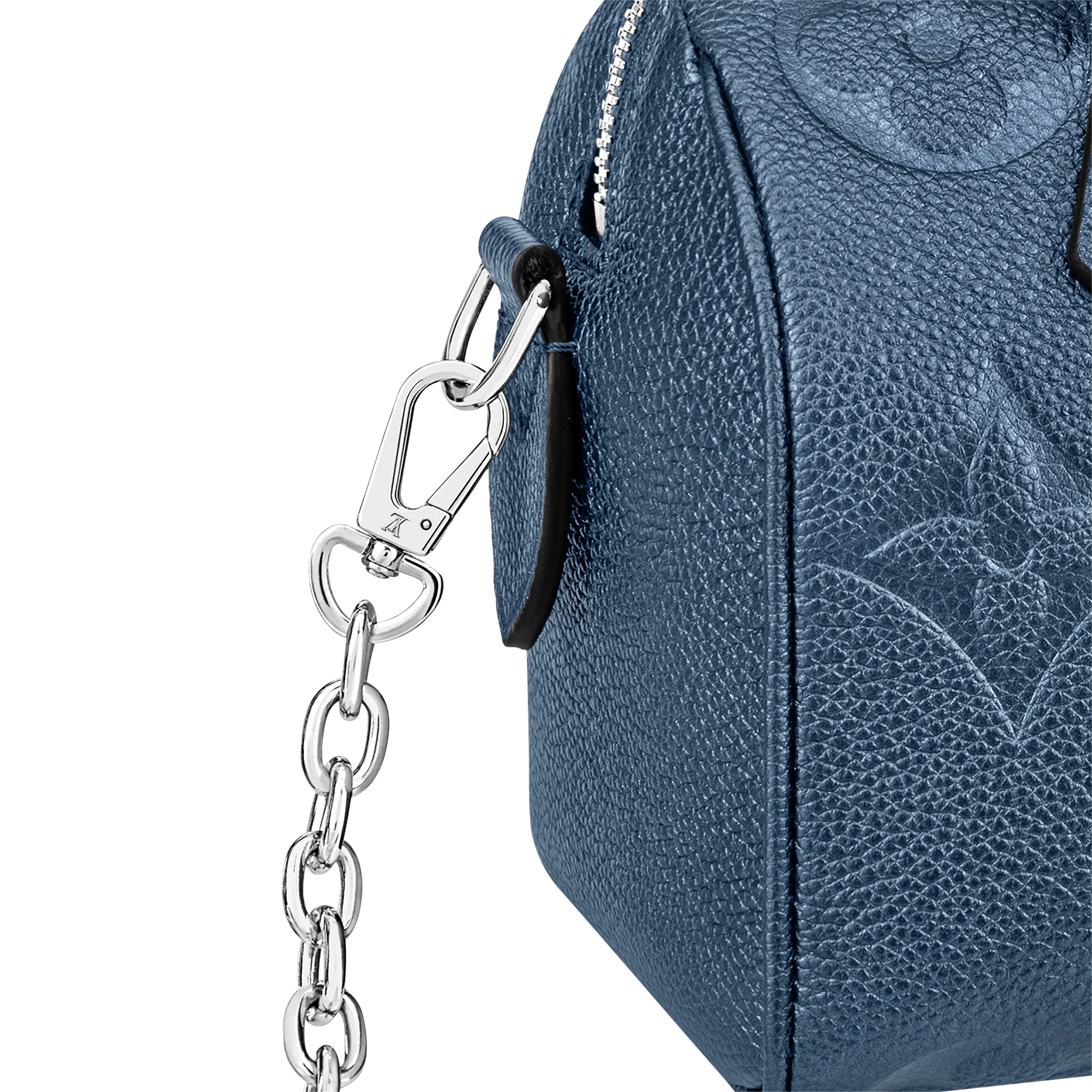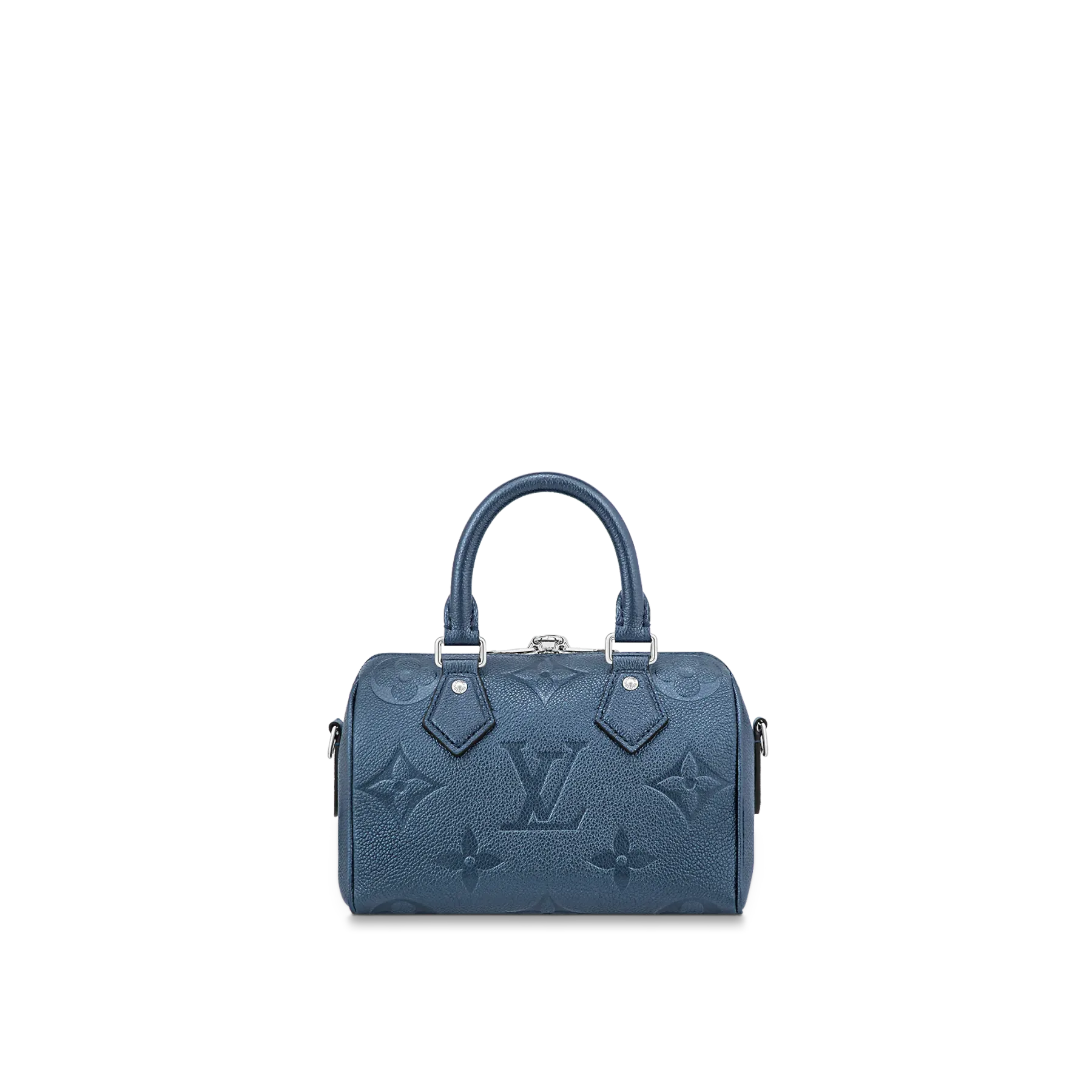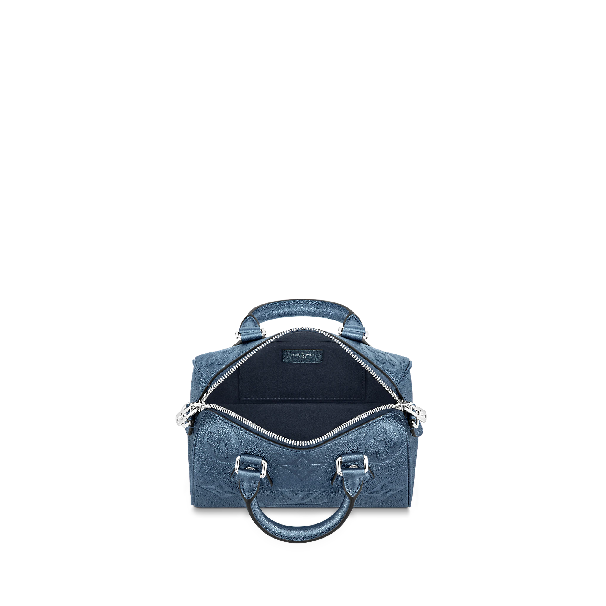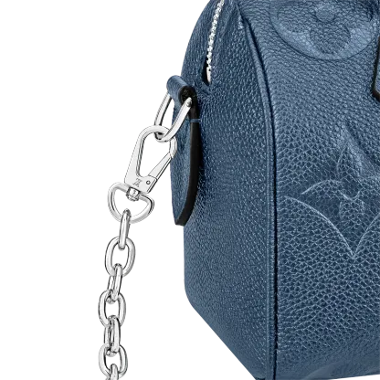 With its singular silhouette, Toron handles and engraved padlock, the adorable Speedy Bandoulière 20 handbag is emblematic of Louis Vuitton’s design traditions. In shimmering and festive navy-blue Monogram Empreinte leather with the Oversized Monogram pattern, it is the perfect contemporary companion. A removable chain-and-leather strap enable shoulder and cross-body carry.